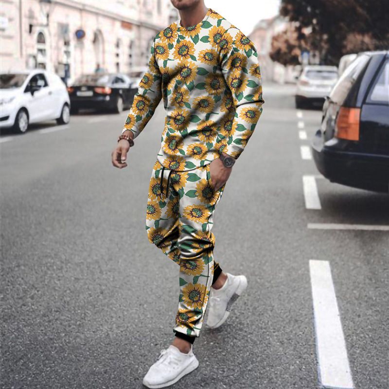 Printed Round Neck Fashion Long-sleeved Casual Suit Black 3XL