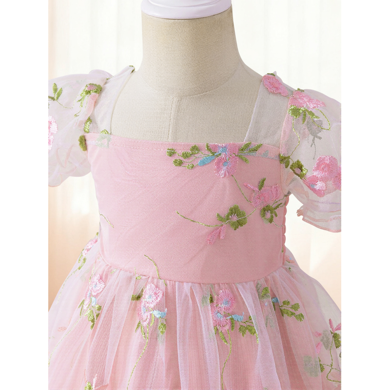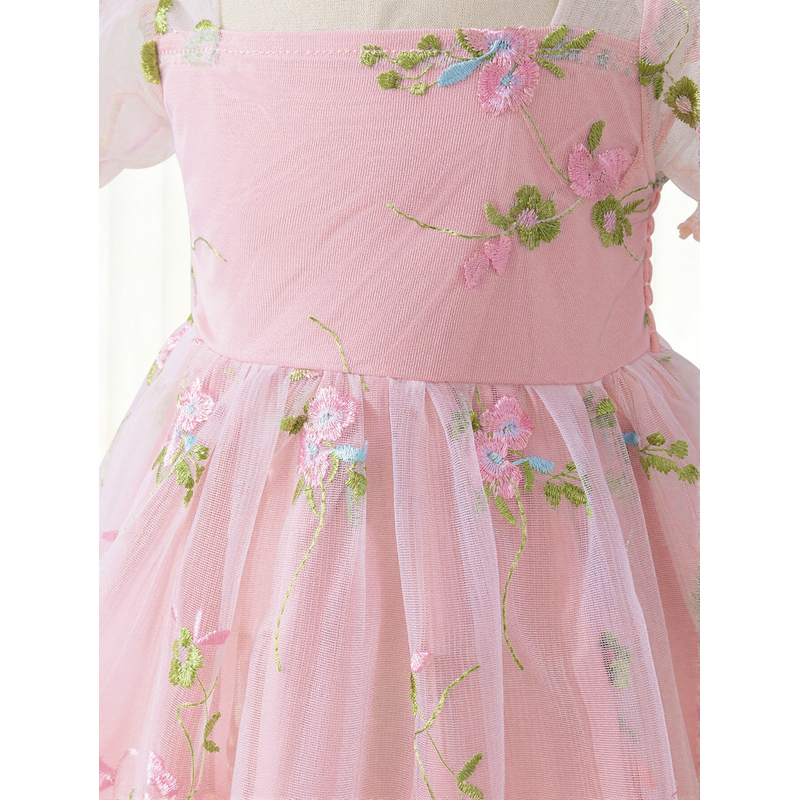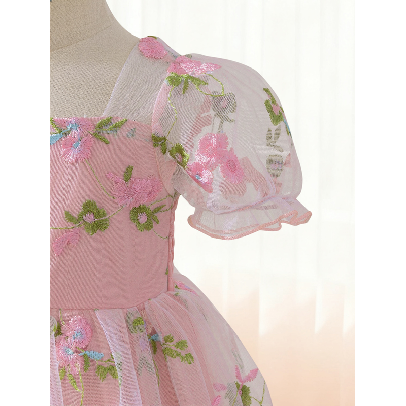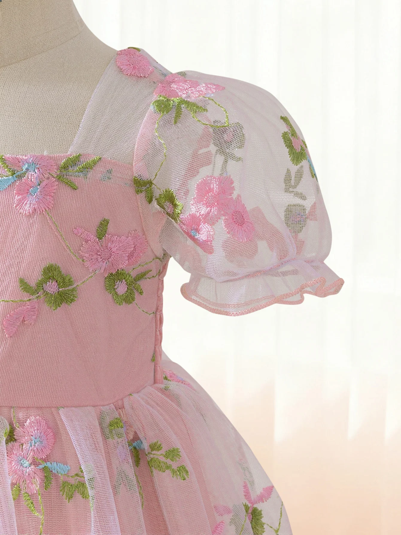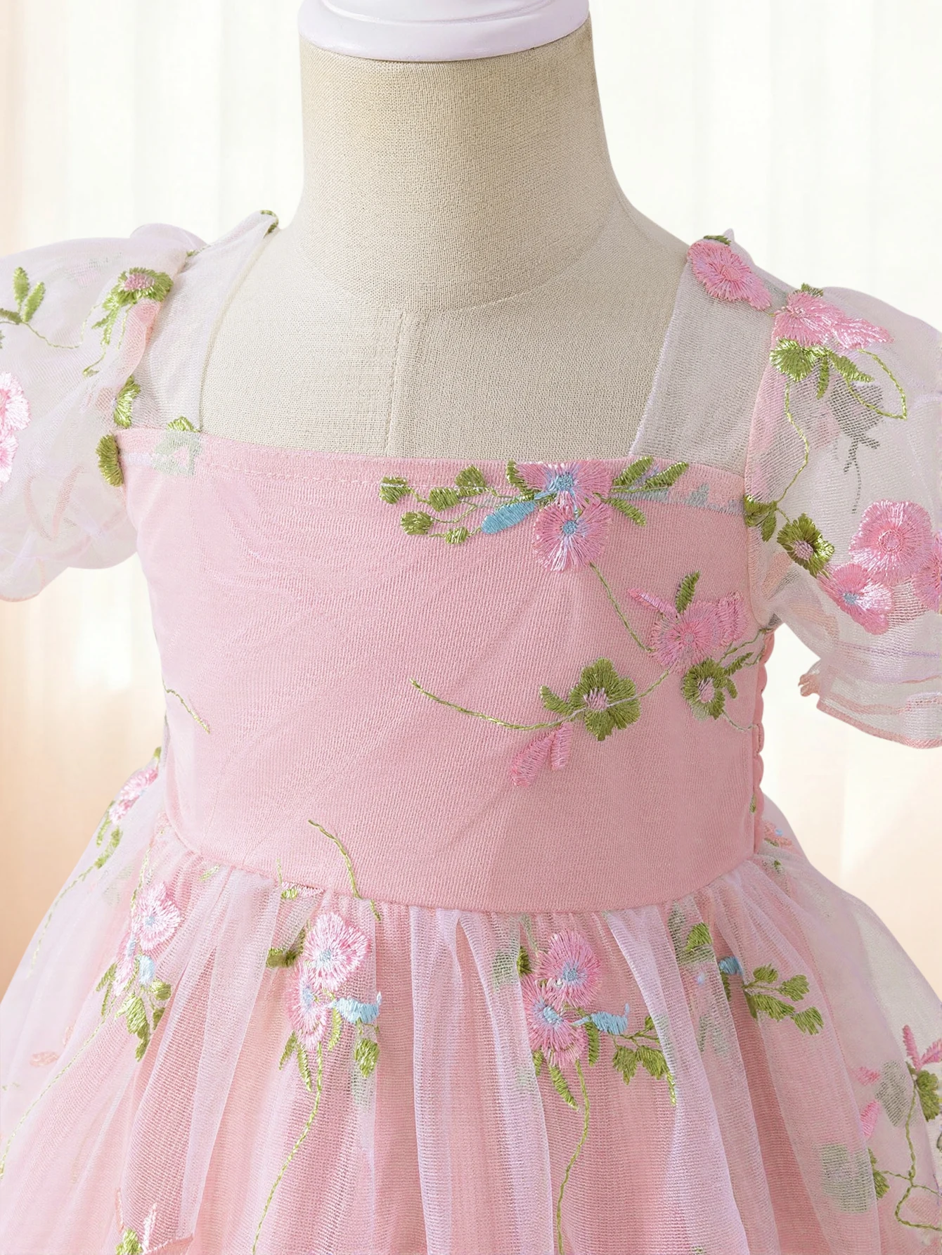 1-Piece Summer Thin Dress for Baby Girls, Baby Girl's Three-Dimensional Embroidered Floral Decoration Square Neck Puff Sleeve Fashionable Sweet Dress, Cute Ladylike Pastoral Style Lantern Sleeve Tulle Dress Versatile Princess Dress, Newborn First Birthday