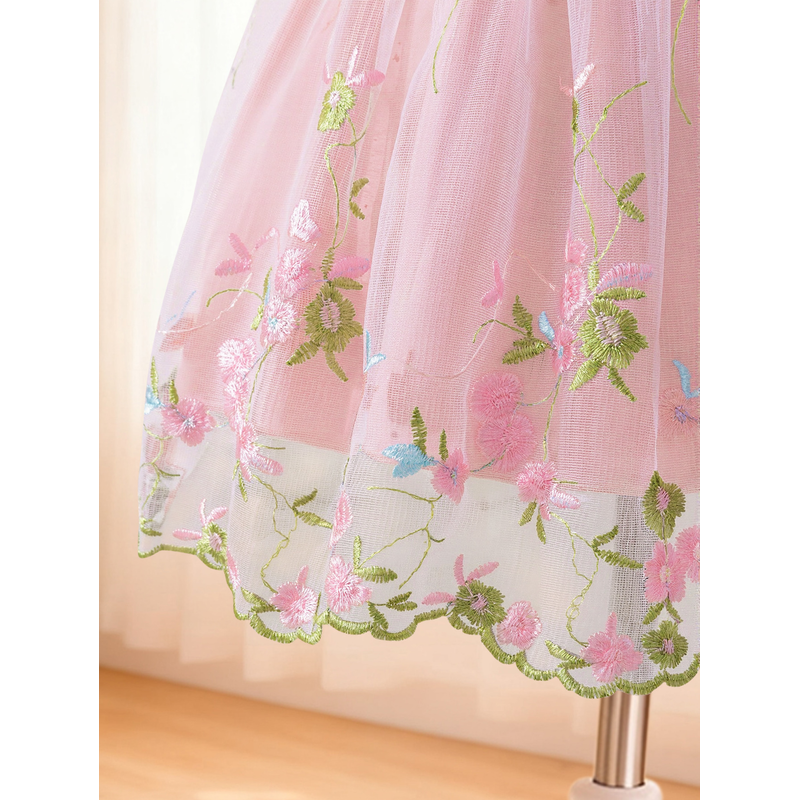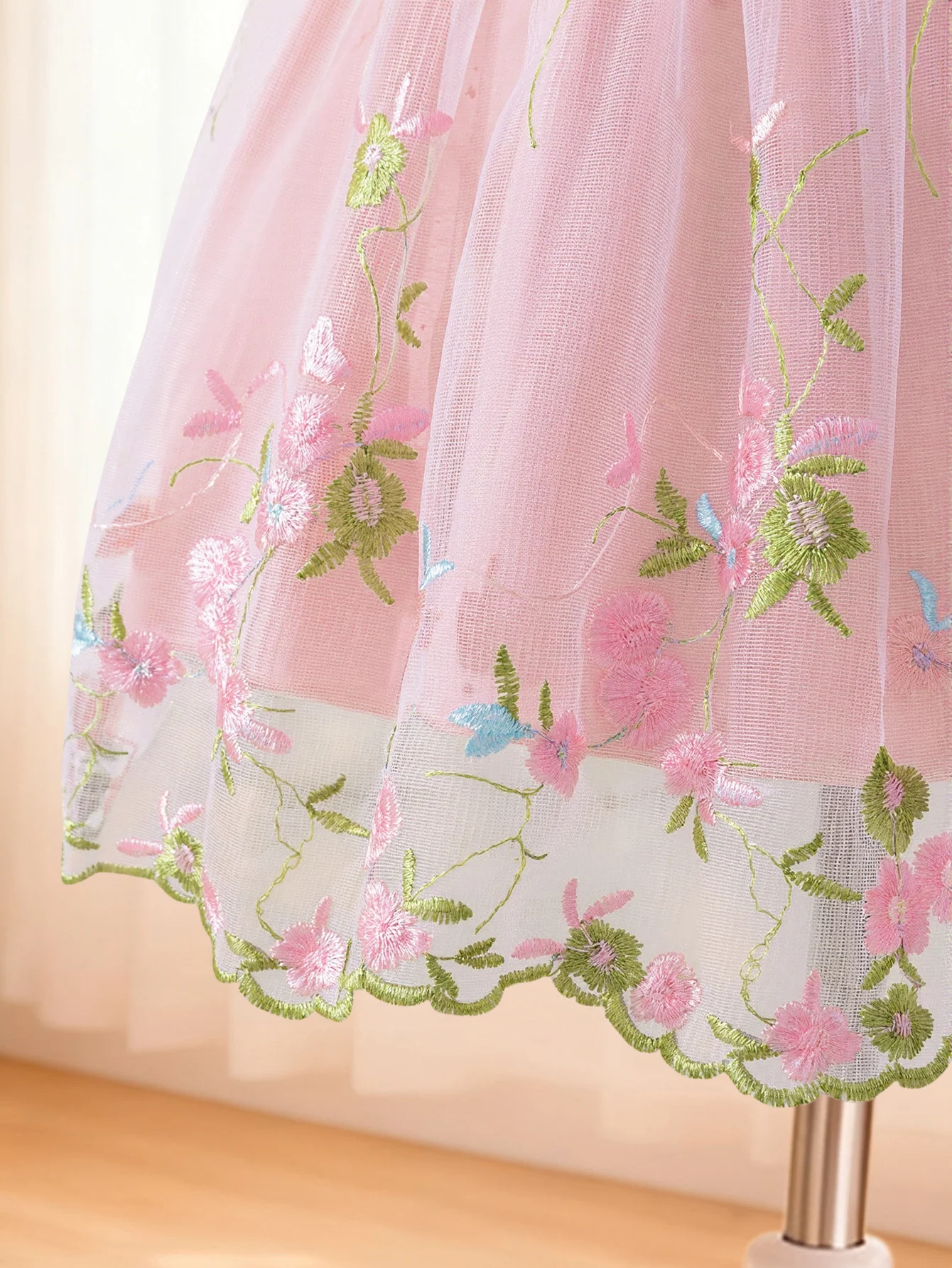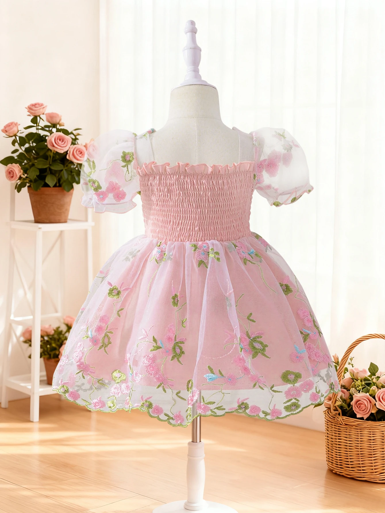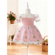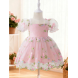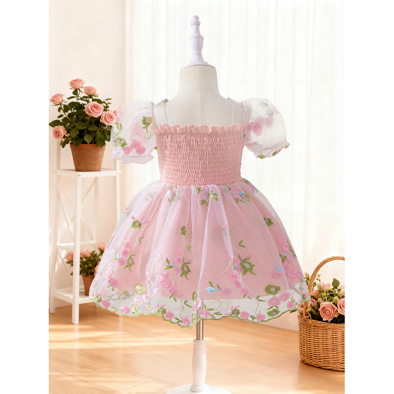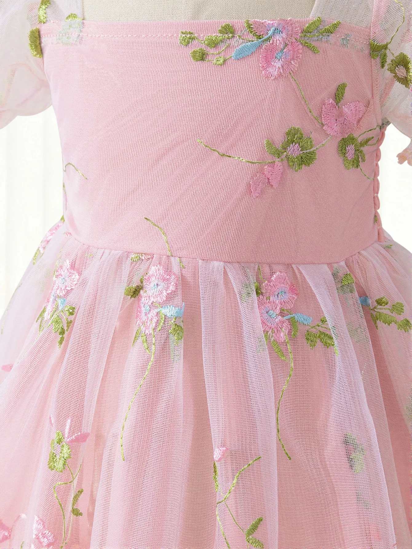 1-Piece Summer Thin Dress for Baby Girls, Baby Girl's Three-Dimensional Embroidered Floral Decoration Square Neck Puff Sleeve Fashionable Sweet Dress, Cute Ladylike Pastoral Style Lantern Sleeve Tulle Dress Versatile Princess Dress, Newborn First Birthday