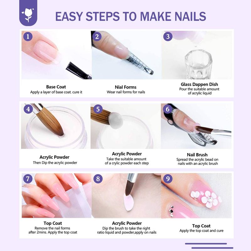 ALL-IN ONE ACRYLIC NAIL KIT: Acrylic Nail Kit for beginners with everything, Comes with 3 Acrylic Powder(30g), Acrylic Liquid Monomer(58ml), UV Light, 24 colors of Glitter Powder and Sequins, Colored Nail Rhinestones, Acrylic Nail Brush, 200pcs Various Size Nail Tips and other Nail Art Tools.Wtih our Acrylic Nail Kits, you can DIY nail art at home without going to the salon!