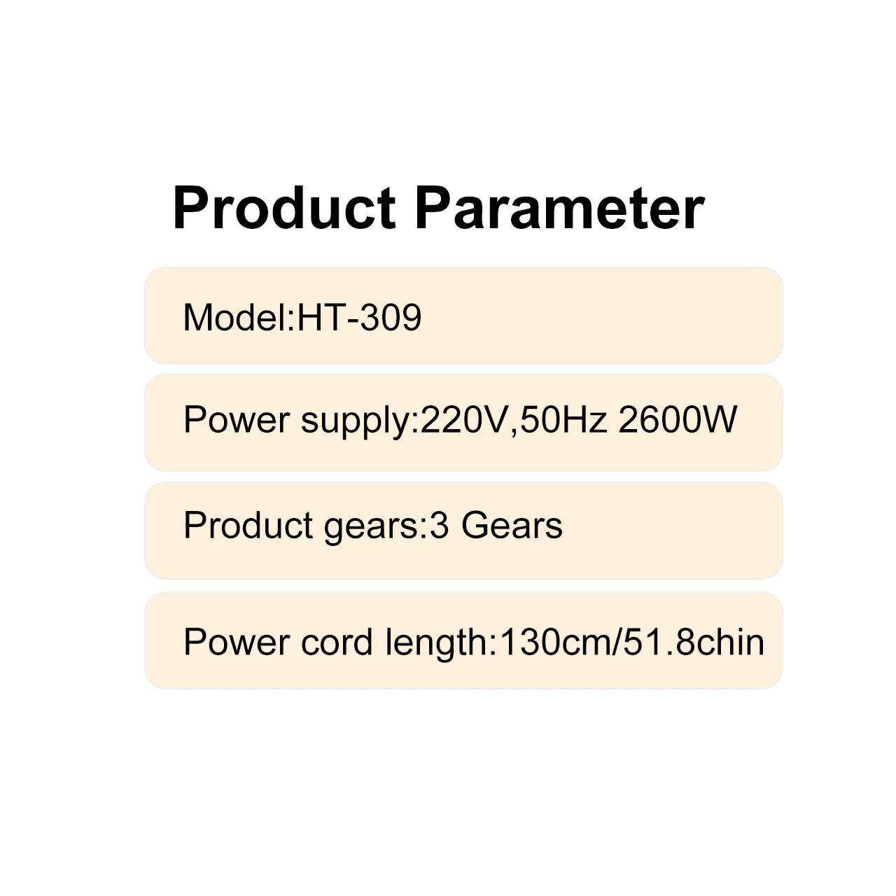 - 130cm (51.8”) long power cord for flexibility