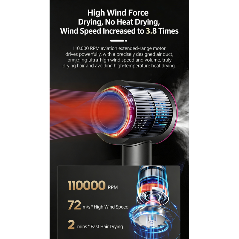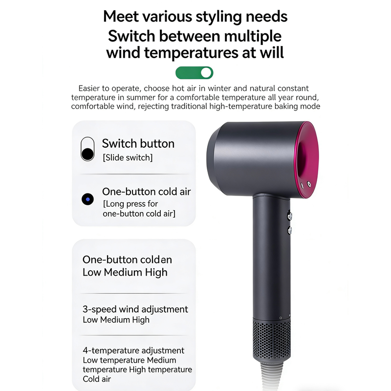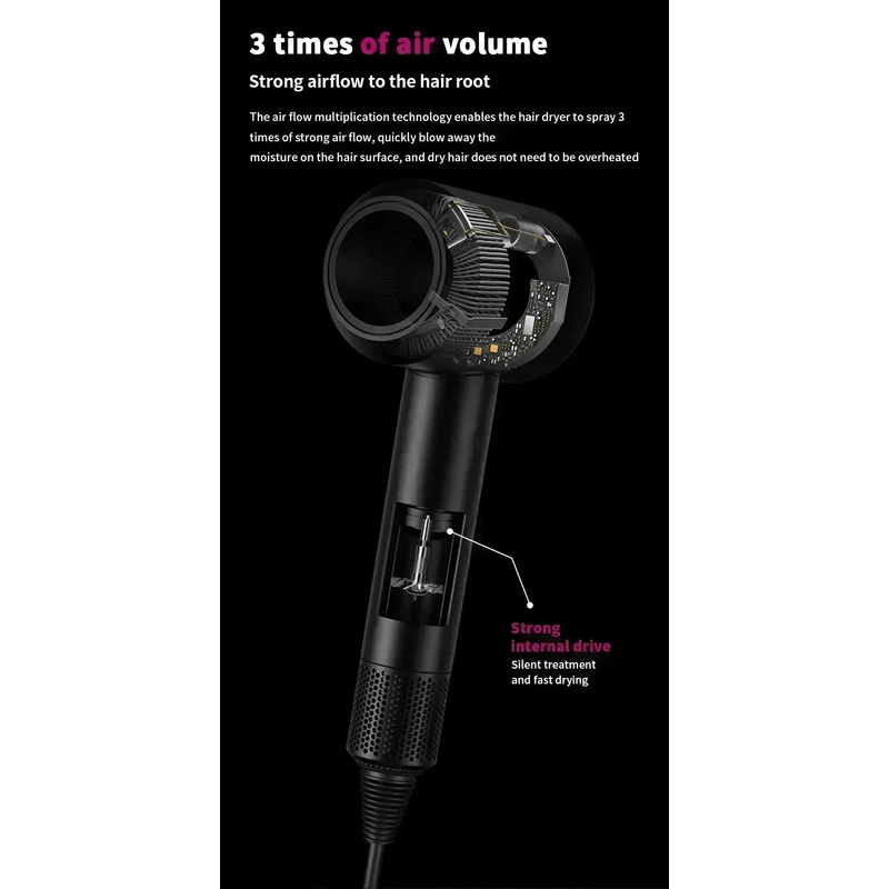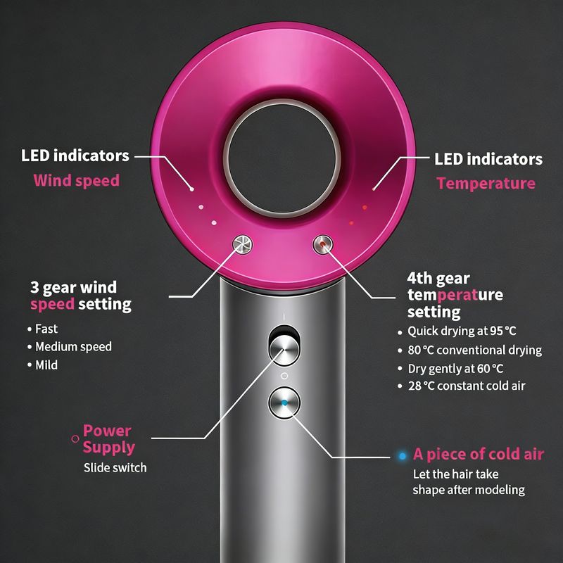 Elegant design:With its striking metal color and fuchsia, this dryer is not only functional, but also a fashion accessory that will add a touch of style to your hair care routine.