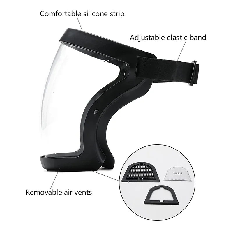 This anti-fog full face shield has large lenses, provides excellent optical clarity and panoramic vision, and uses a soft silicone frame, which can perfectly fit the face, suitable for most people's faces and provide long-term comfort, full-face The design ensures full protection from the head to the chin, and we provide filter pads, which can protect your every breath!