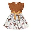 Little Girl 2 Piece Summer Outfits Round Neck Fly Sleeve Ribbed Butterfly Print Dress + Solid Color Belt Set