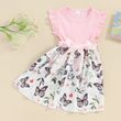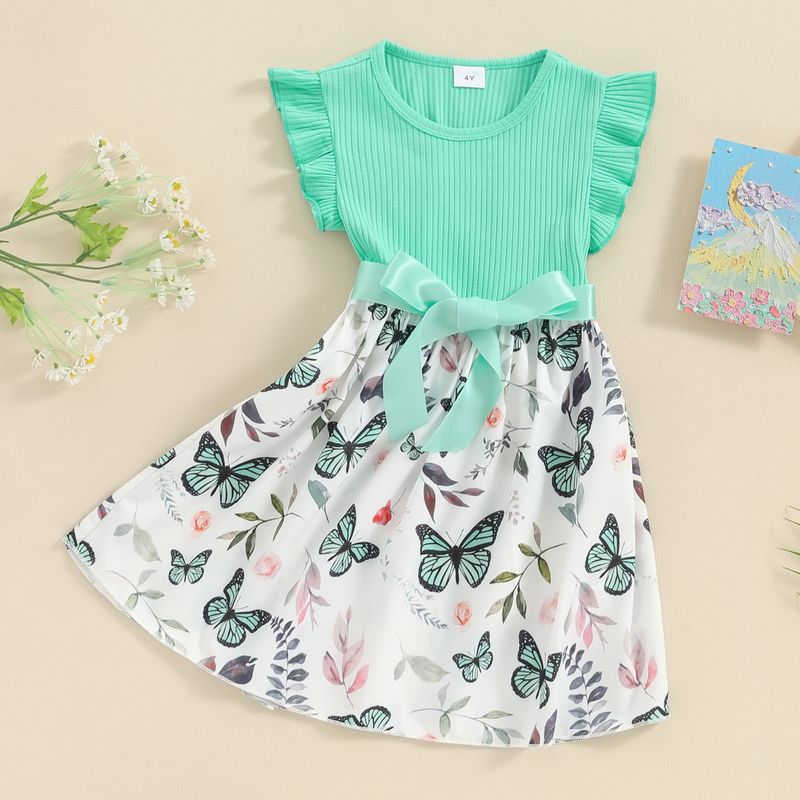 Little Girl 2 Piece Summer Outfits Round Neck Fly Sleeve Ribbed Butterfly Print Dress + Solid Color Belt Set