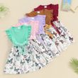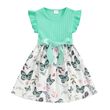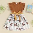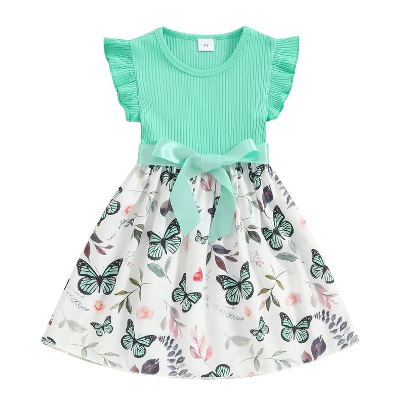 Little Girl 2 Piece Summer Outfits Round Neck Fly Sleeve Ribbed Butterfly Print Dress + Solid Color Belt Set