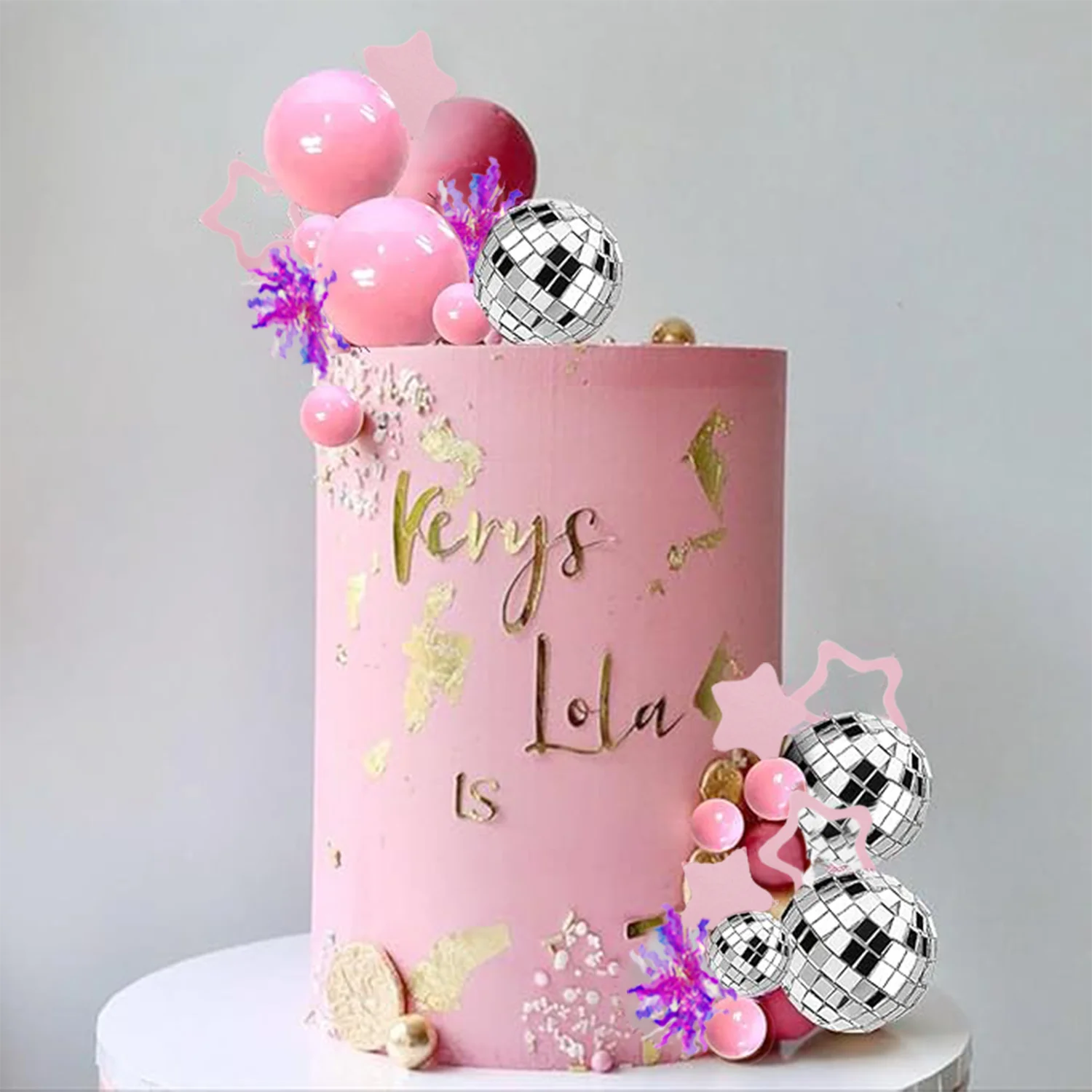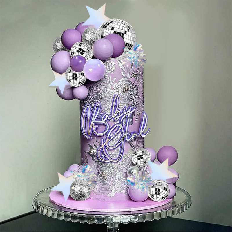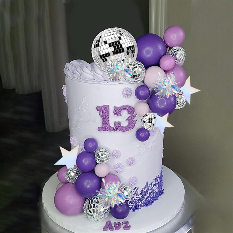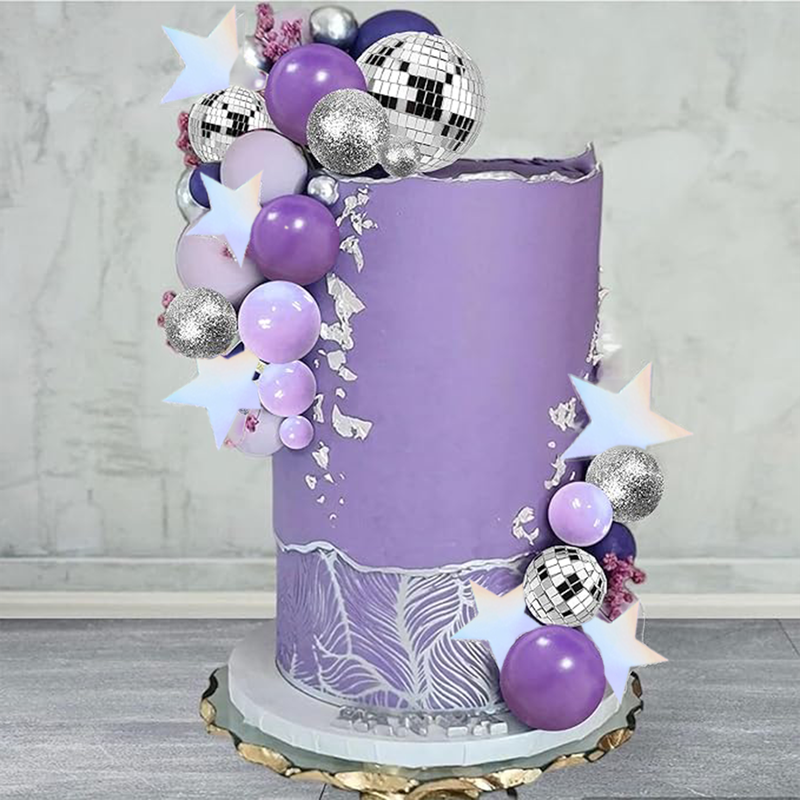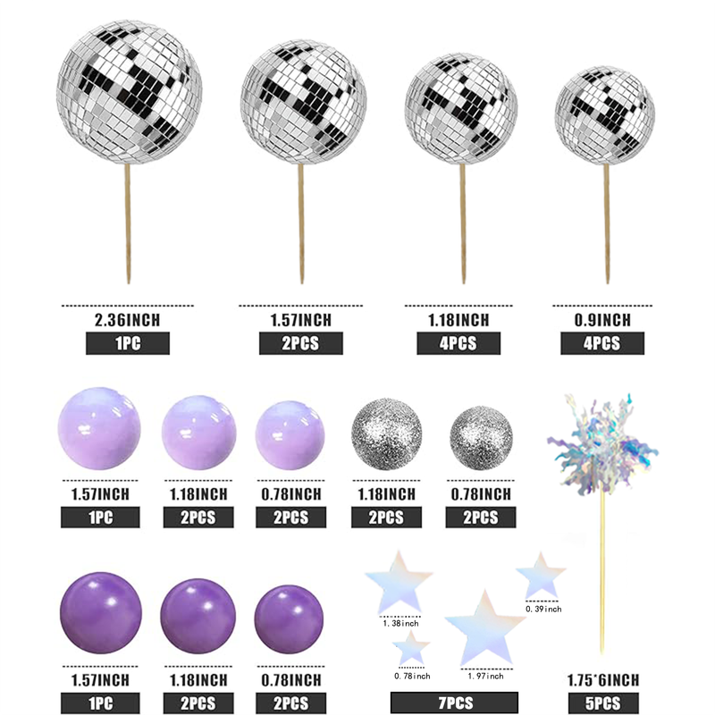 【Package Contents】:This purple disco ball cake topper including 5 purple balls, 5 dark purple balls, 11 mirror disco balls of different sizes, 4 silver shining balls, 7 silver star cake toppers, 5 sliver firework cupcake toppers. This pink disco ball cake topper including 5 pink balls, 5 dark pink balls, 11 mirror disco balls of different sizes, 4 rose gold shining balls, 8 pink star cake toppers, 5 purplish red firework cupcake toppers.