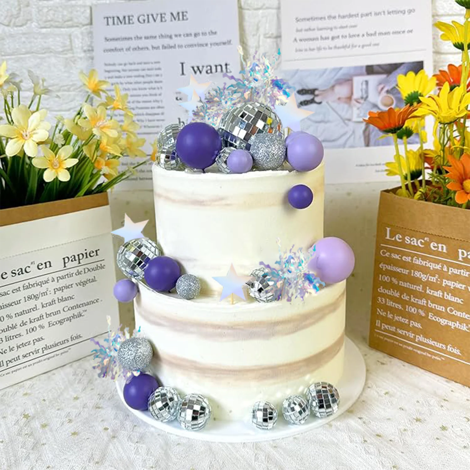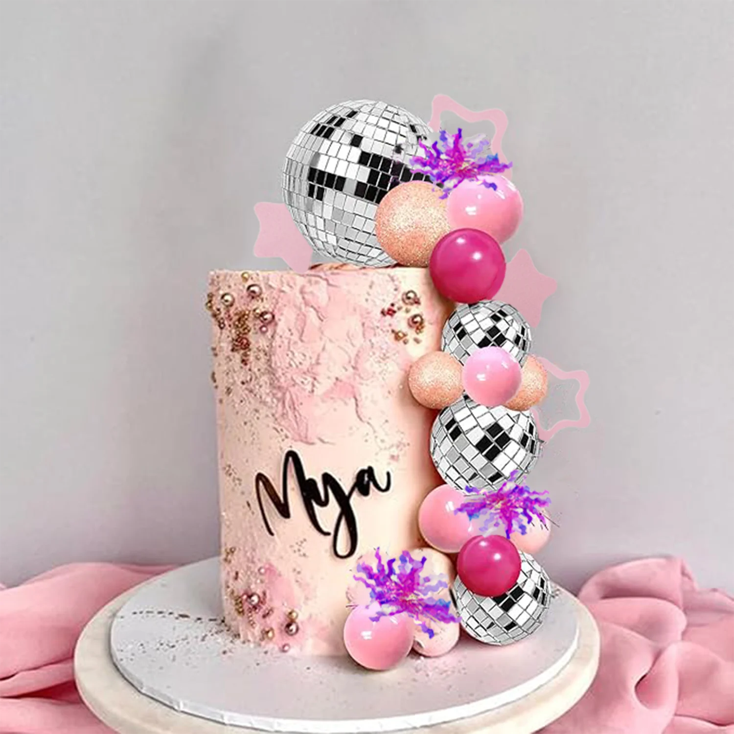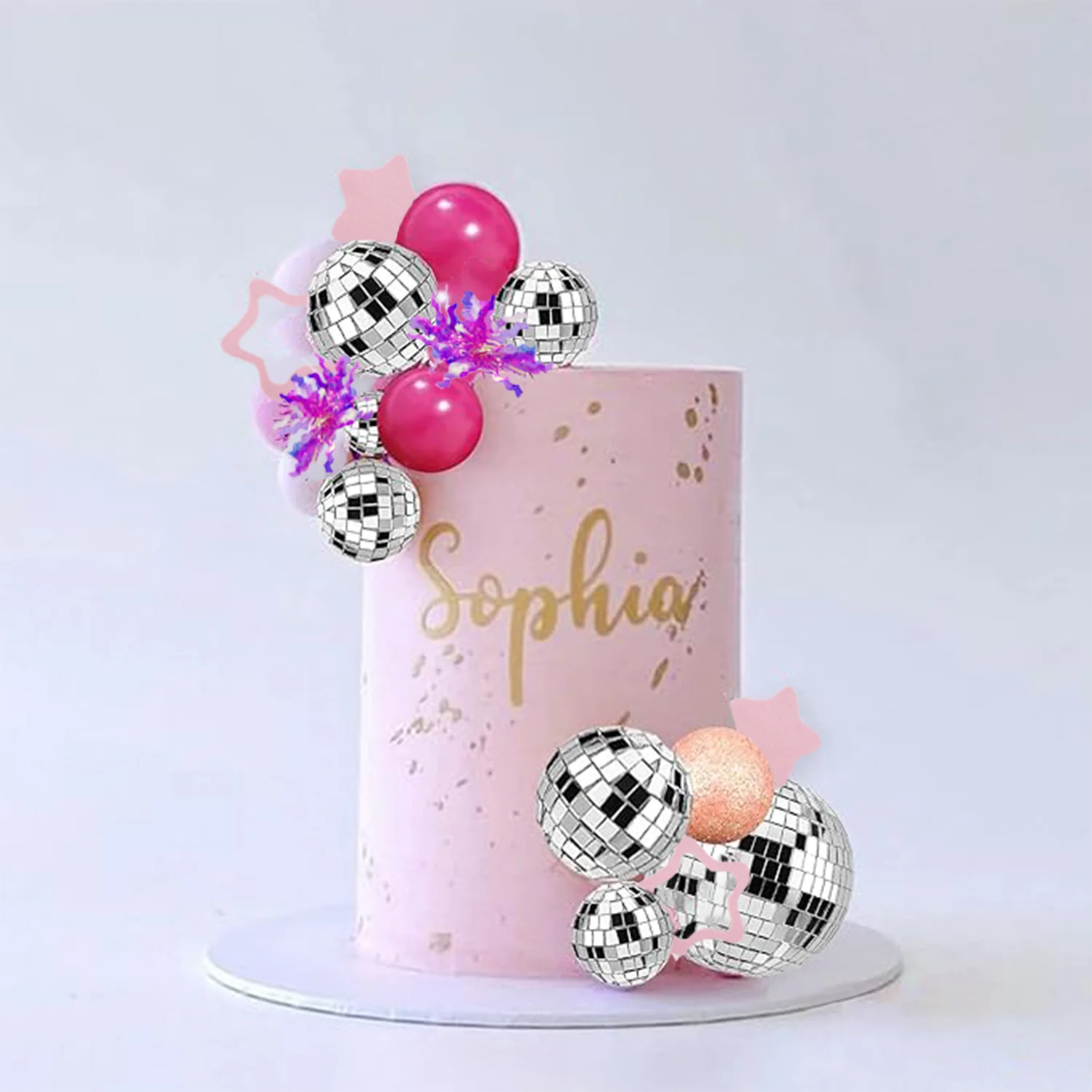 【Package Contents】:This purple disco ball cake topper including 5 purple balls, 5 dark purple balls, 11 mirror disco balls of different sizes, 4 silver shining balls, 7 silver star cake toppers, 5 sliver firework cupcake toppers. This pink disco ball cake topper including 5 pink balls, 5 dark pink balls, 11 mirror disco balls of different sizes, 4 rose gold shining balls, 8 pink star cake toppers, 5 purplish red firework cupcake toppers.
