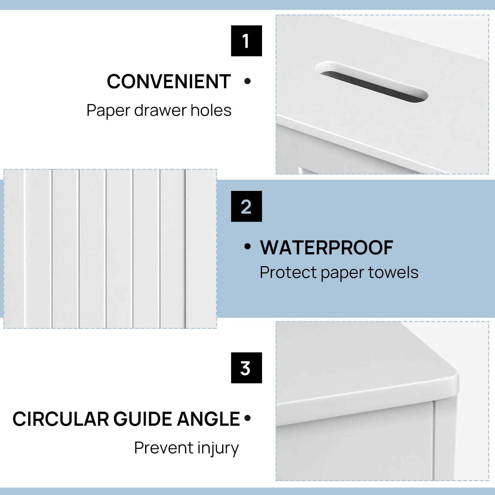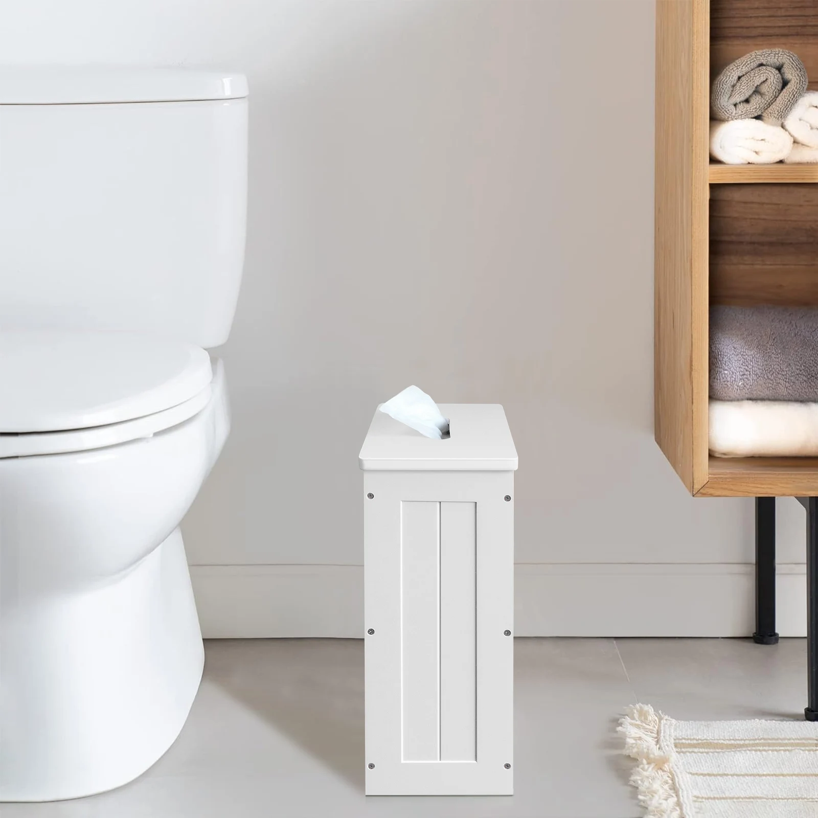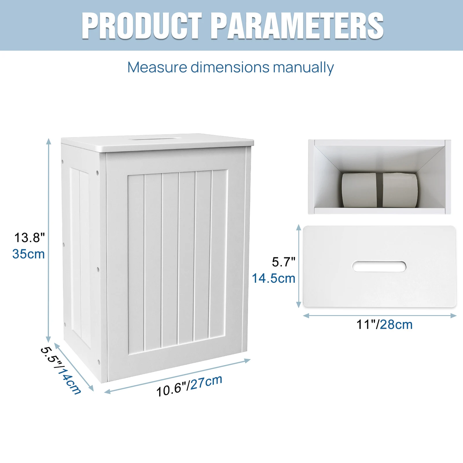 Easy to clean and assemble: The assembly process of this bathroom storage unit is very simple, and the included manual describes the assembly process in detail. No need to worry about complicated settings. You can clean your tissue storage cabinet just by wiping it with a damp cloth!