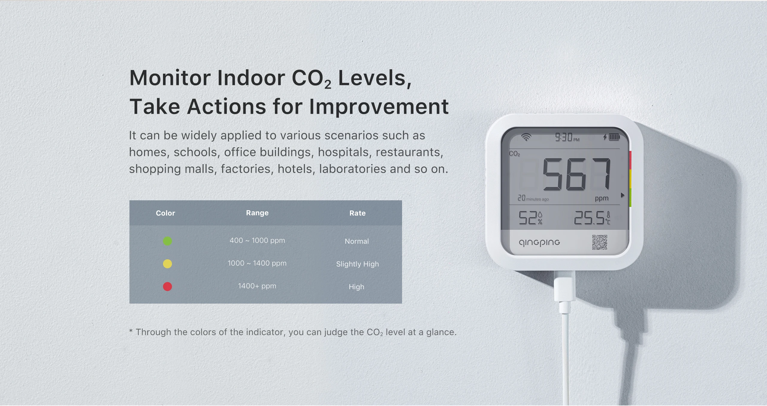 【Monitor Indoor CO2 Levels】Equipped with a Swiss-made Sensirion CO2 sensor that utilizes NDIR technology to provide precise and sensitive measurements. The colored indicator lets users quickly judge the CO2 level. It finds extensive applications across diverse settings, including homes, schools, office buildings, hospitals, restaurants, shopping malls, factories, hotels, laboratories, and more.