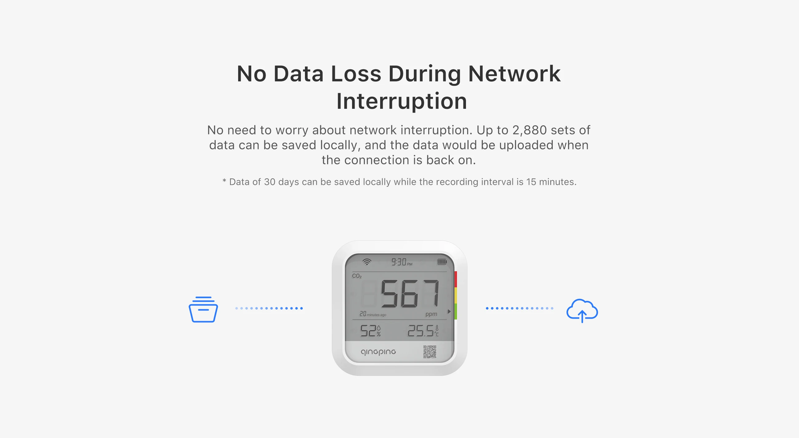 【View and Export Historical Data】Historical data graphics of recent 24 hours and 30 days are available on Qingping IoT, while the data can be exported as Excel files. No need to worry about network interruption -- the device can save up to 2,880 sets of readings locally, and the data will be uploaded to the server when the connection is back on.