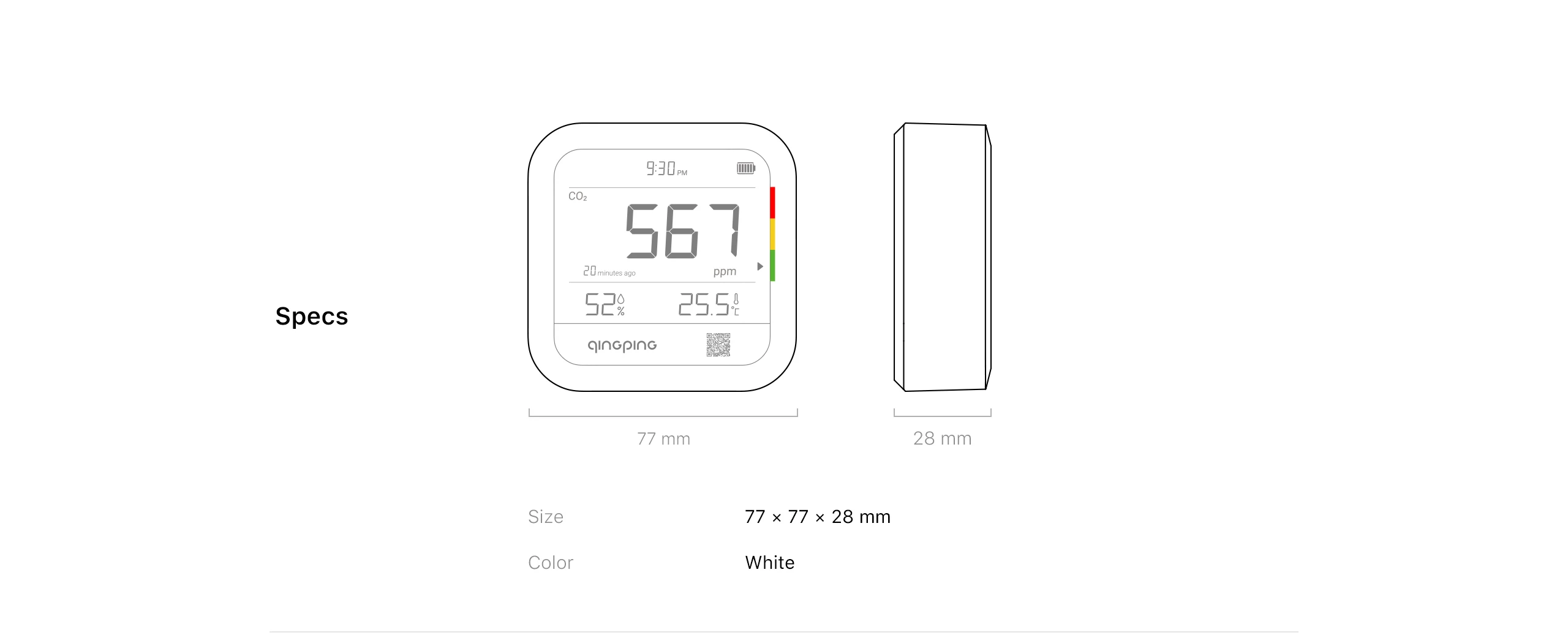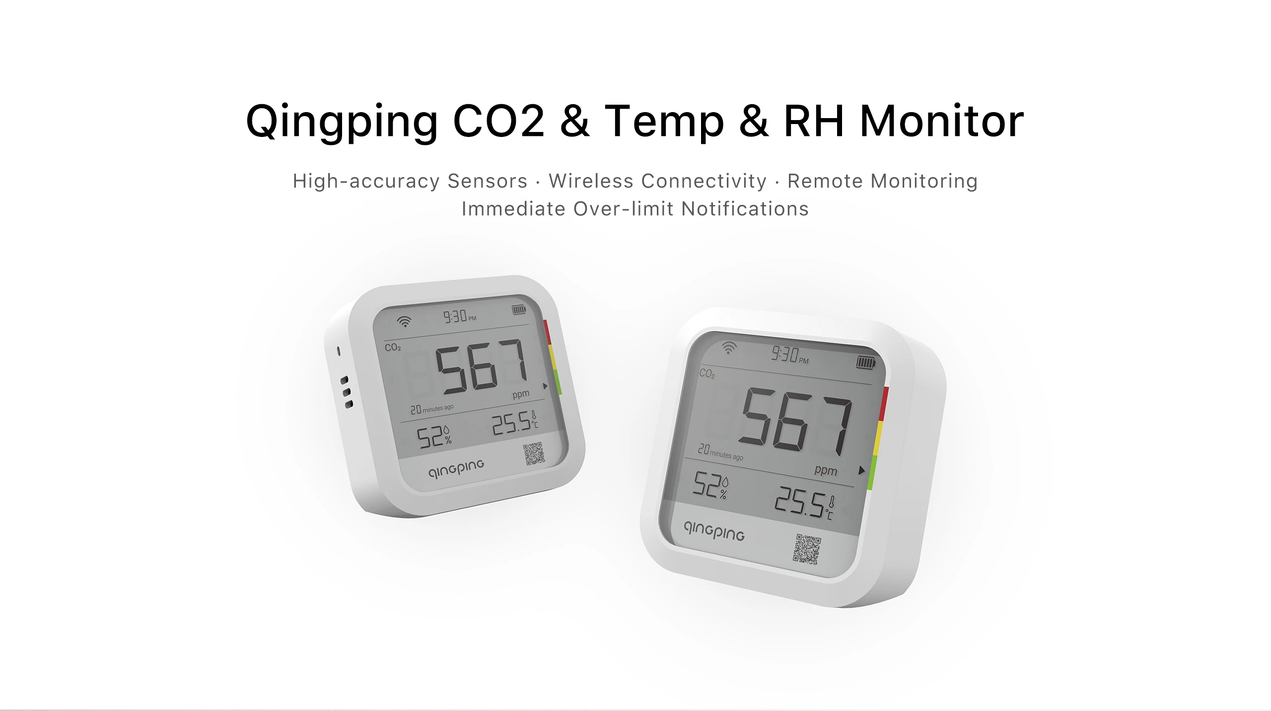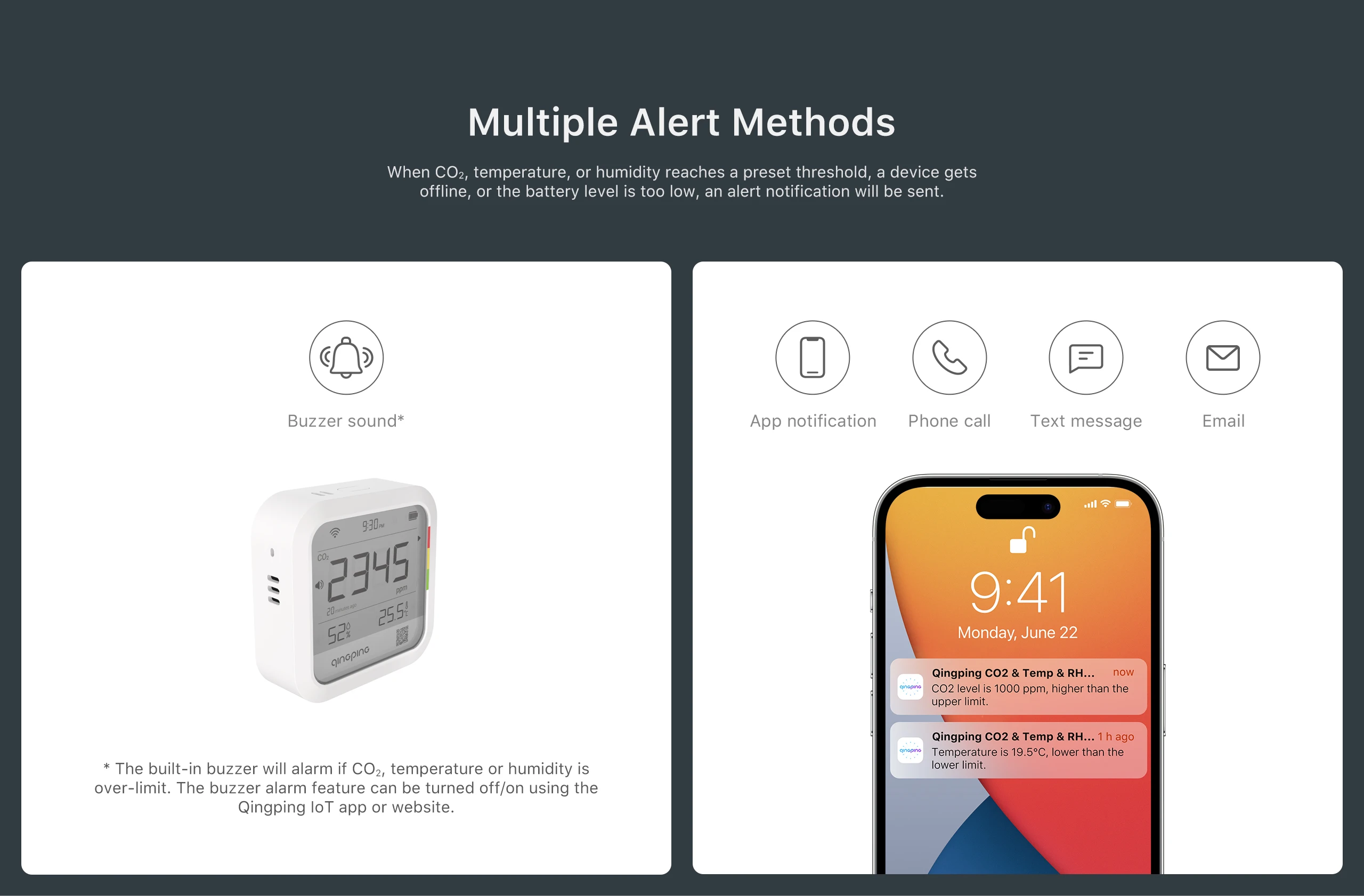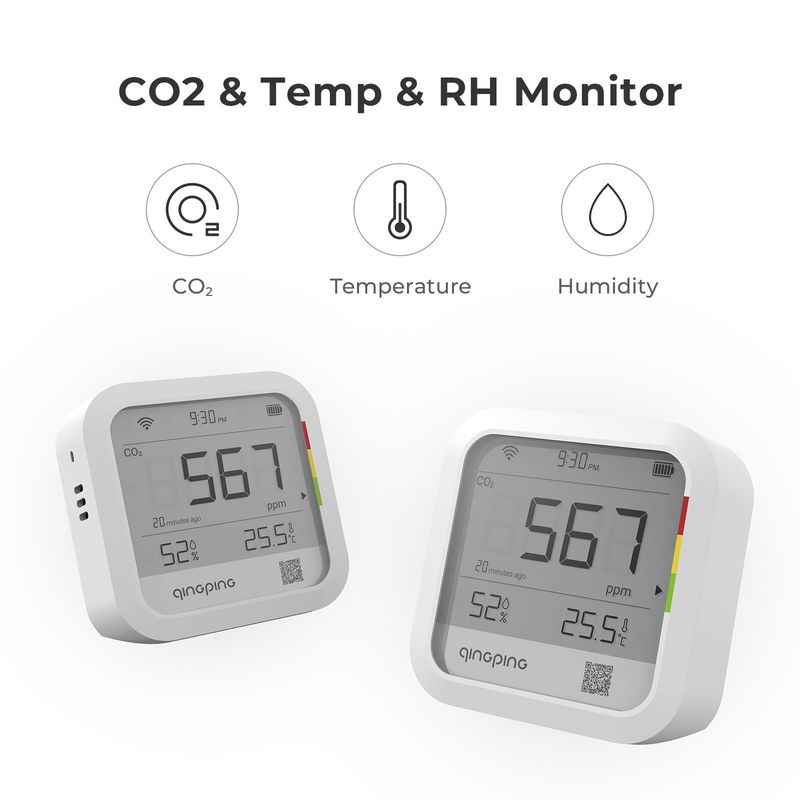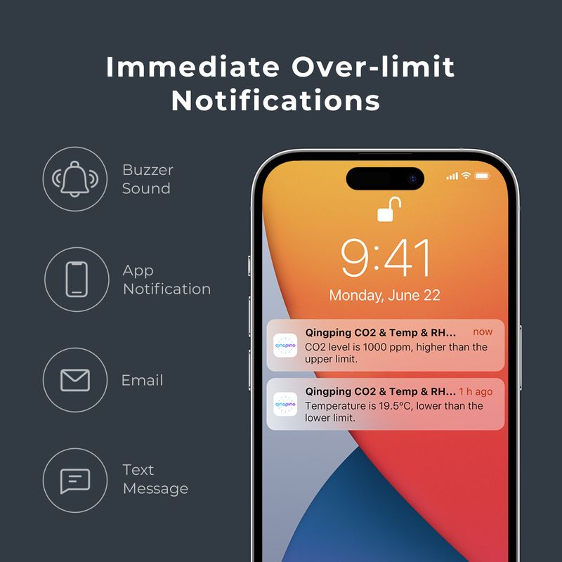 【Multiple Alert Methods】The built-in buzzer will alarm if CO2, temperature or humidity is over-limit. You can also get alerts via app notifications, emails, and text messages. * The buzzer alarm feature can be turned off/on using the Qingping IoT app or website.