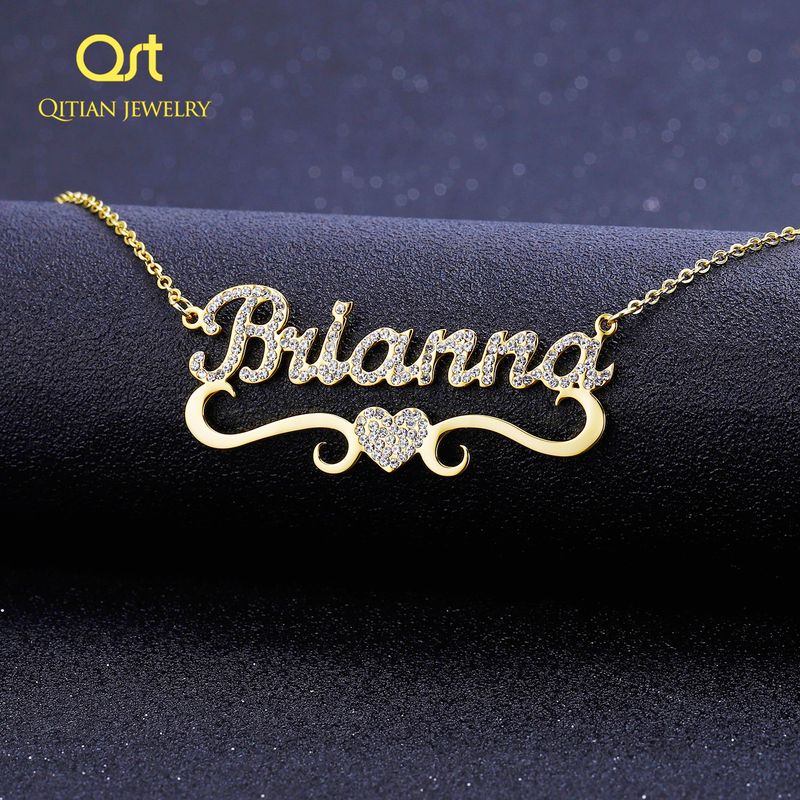 Qitian Personalized Name Necklace With Heart For Women Custom Gold Stainless Steel BlingBling Pendant Custom Iced Out Necklaces