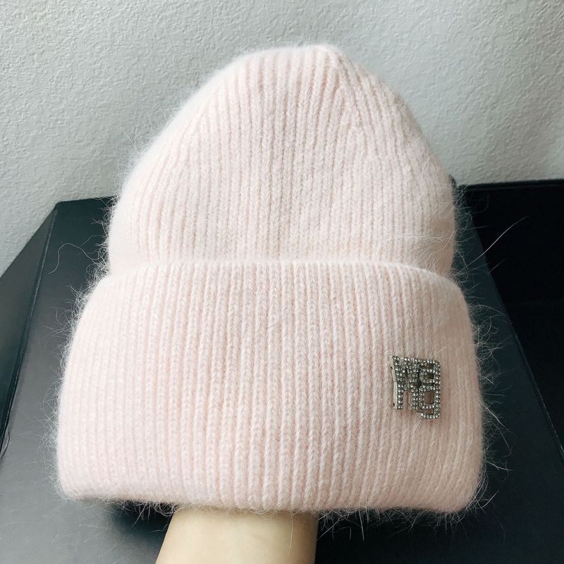 Rabbit Hair Double Fold Brim Knitted Hat Pink Free Size