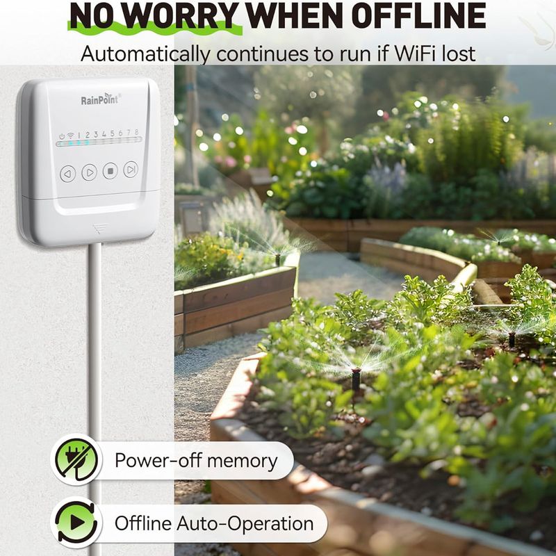 Year-round Protect Your Yard: Even during power outages, our smart sprinkler controller retains programming and automatically resumes once power is restored. Data remains intact, and the controller continues to operate the next scheduled plan even if the WiFi connection is lost. Set it up and forget it - RAINPOINT will take care of the rest!
