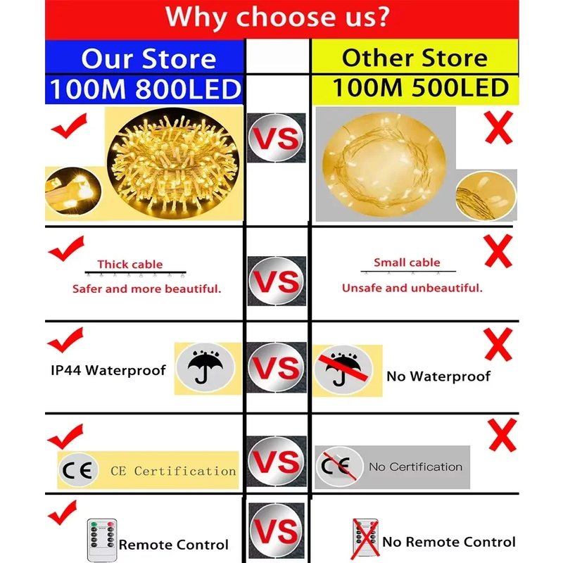 Note:The 100M lights in our shop have 800LEDs, and other shops only have 500LEDs. The quality of 800LEDs will be higher and the effect will be better.