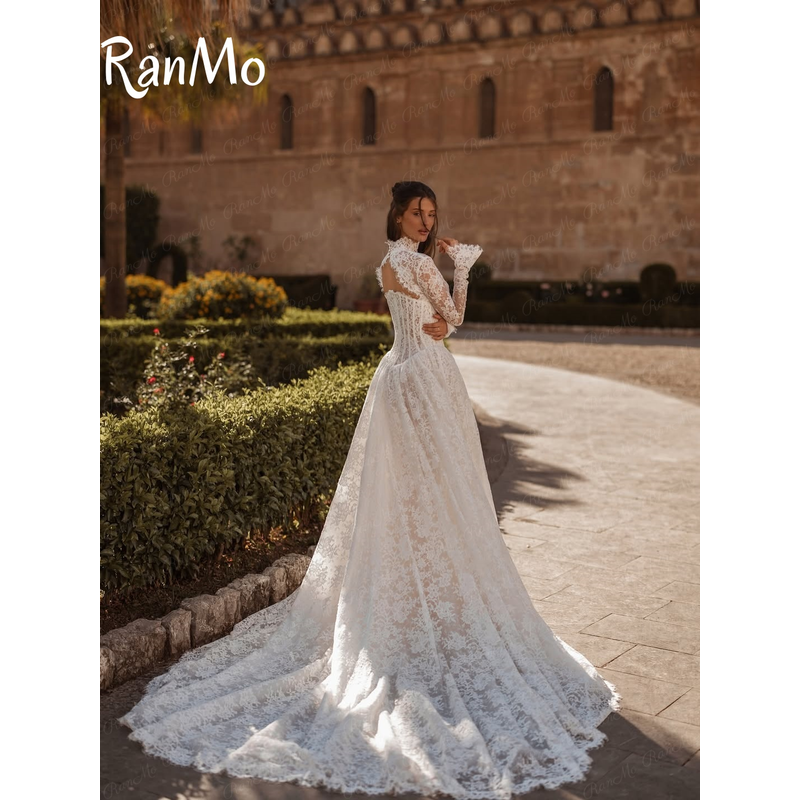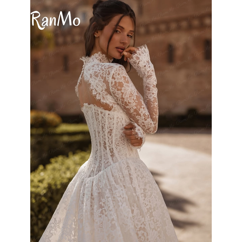Ranmo New 2025 White Wedding Dress High Neck A-Line Full Sleeve Lace Wedding Gowns Luxury Boho Bridal Ball Prom Dress Customised