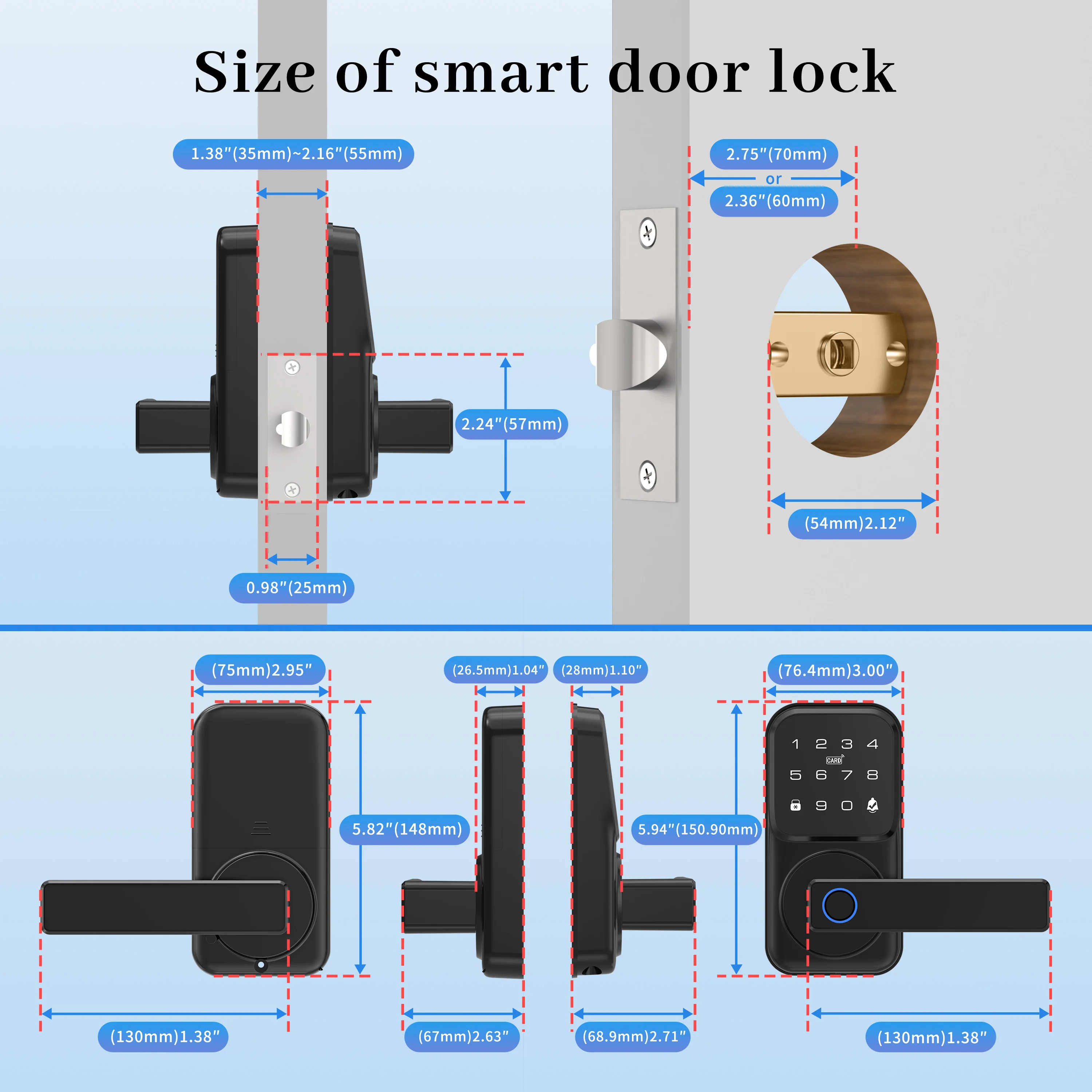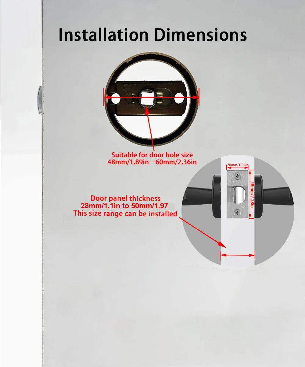 8. Universal for left and right openning, suitable for 28mm~50mm door thickness.