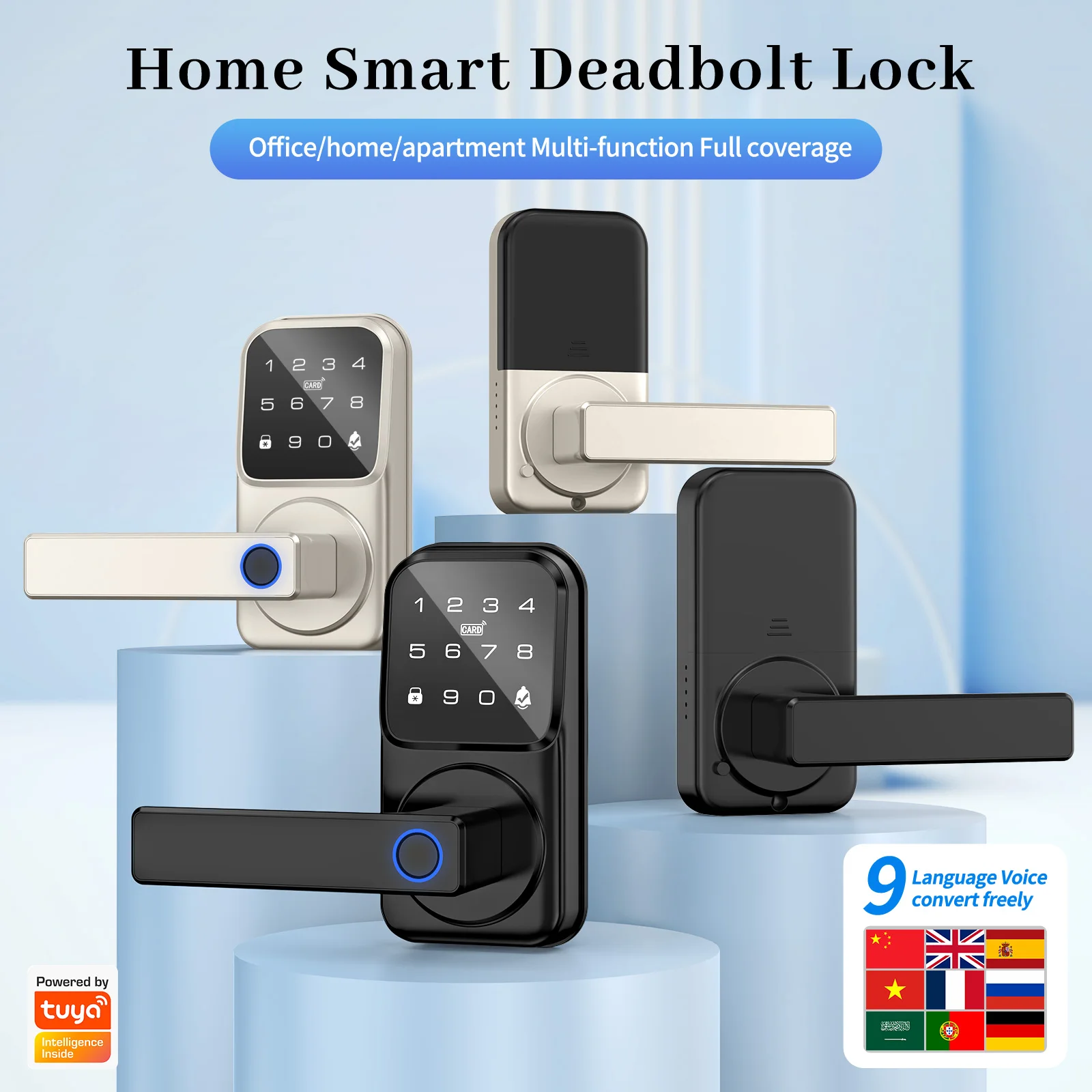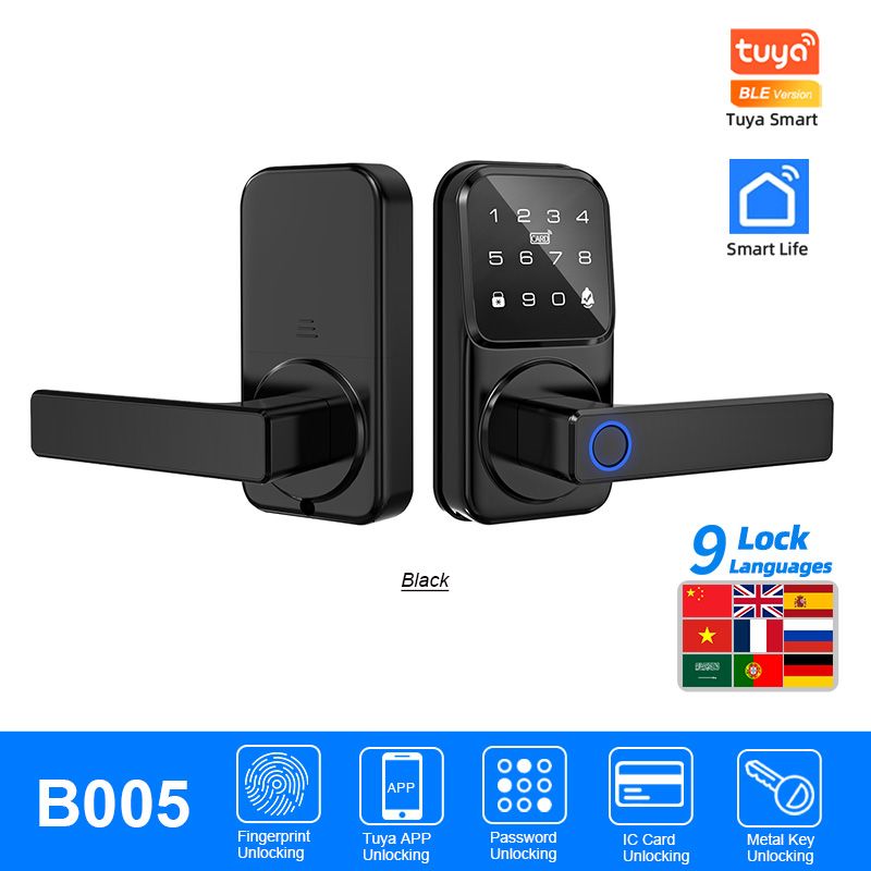 B005 and B006 are Tuya Bluetooth smart fingerprint locks with a doorbell, available in 9 lock languages and worry free installation