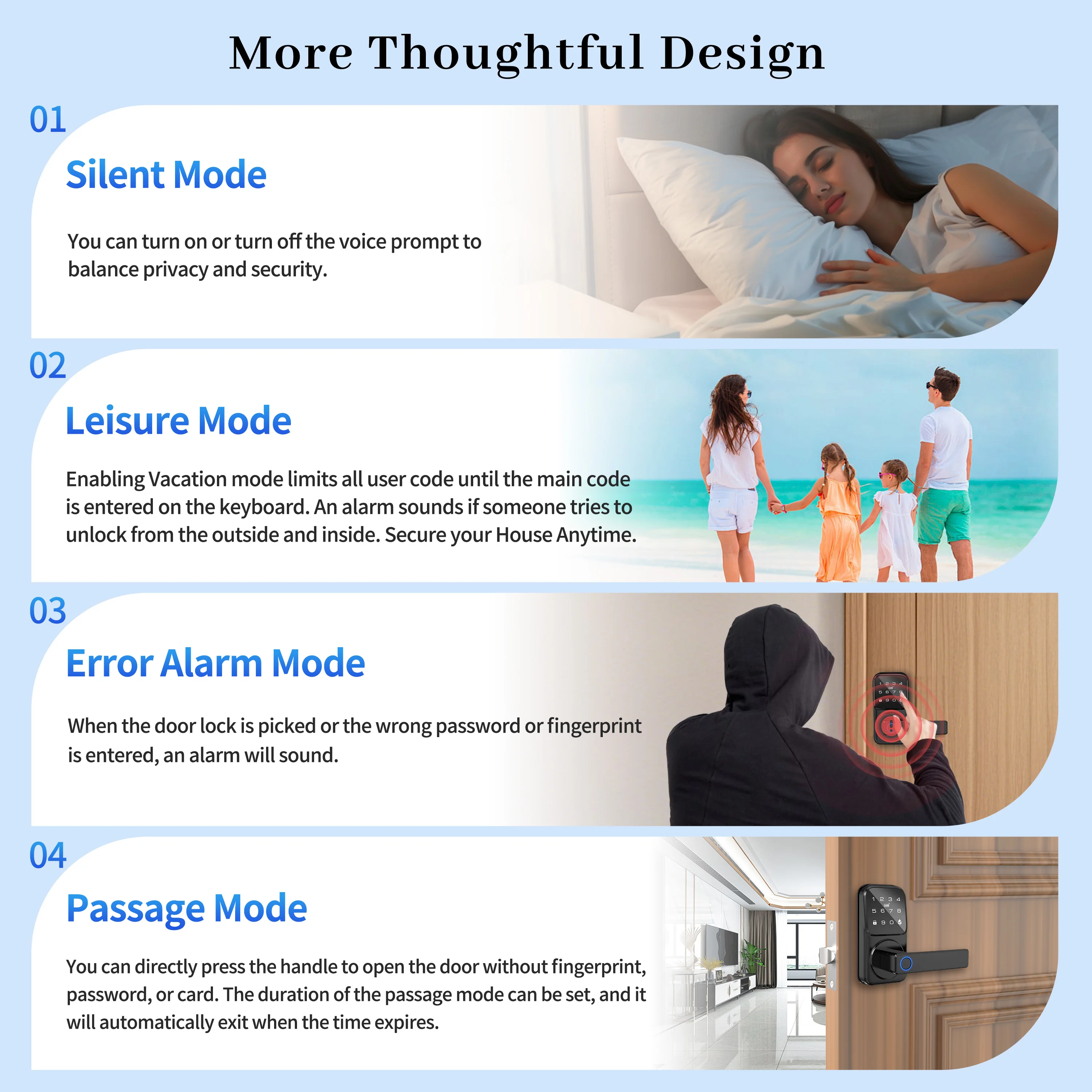 Leisure Mode: Enabling Vacation mode limits all user code until the main codeis entered on the keyboard. An alarm sounds if someone tries tounlock from the outside and inside. Secure your House Anytime.