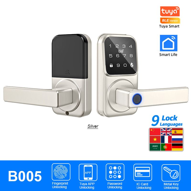 B005 and B006 are Tuya Bluetooth smart fingerprint locks with a doorbell, available in 9 lock languages and worry free installation
