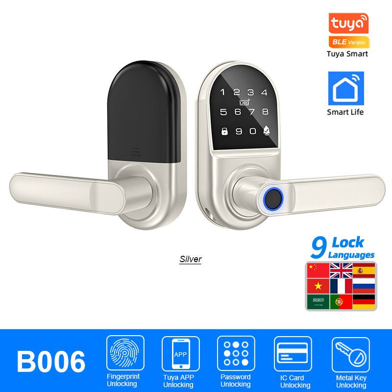B005 and B006 are Tuya Bluetooth smart fingerprint locks with a doorbell, available in 9 lock languages and worry free installation