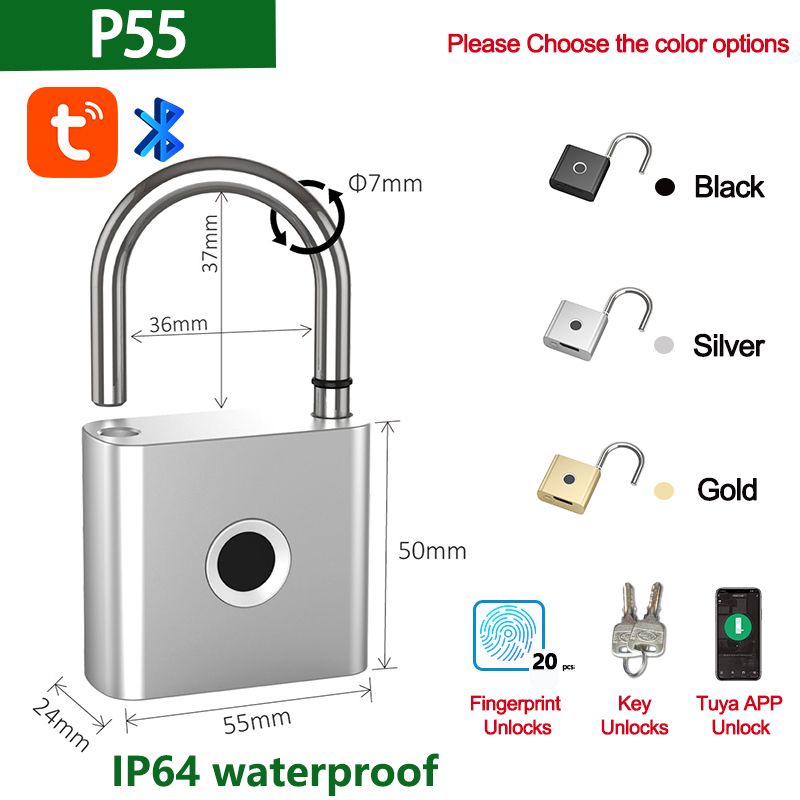 P70/P55 is a smart padlock with Bluetooth (Tuya Smart Life mobile APP) access and management, fingerprint recognition technology, and backup keys. By using Tuya Smart/Smart Life APP, users are available to access the padlock, add/remove fingerprints, authorize families or friends to open the padlock remotely, record unlock log and wrong fingerprint alarms, set intelligent linkages like family members to go home (unlock) notice, etc.