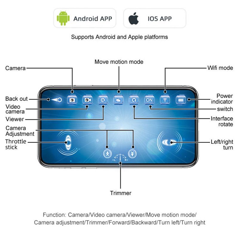 Real - time camera (20 meters), video transmission, iphone, ipad, iPod wifi as a remote control to operate