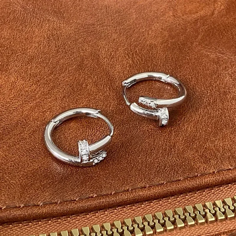 Real 925 Sterling Silver Zircon Nail Round Hoop Earrings for Women Minimalist Trendy Fine Jewelry Shiny Tool Accessories