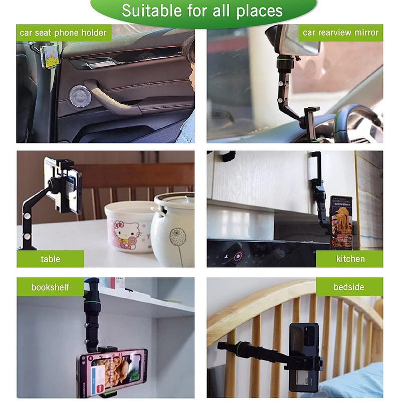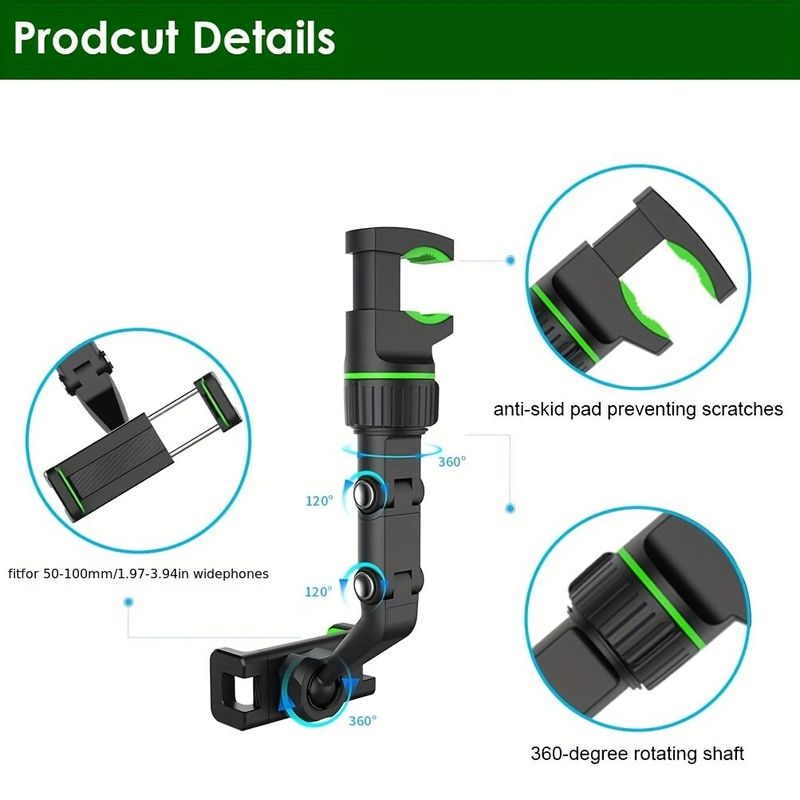 [Multifunctional Rearview Mirror Phone Holder]]: our Rear View Mirror Phone Holder have six degrees of freedom design and 360 ° +120 ° rotating arm joint of the holder allows you to adjust the phone to any angle.