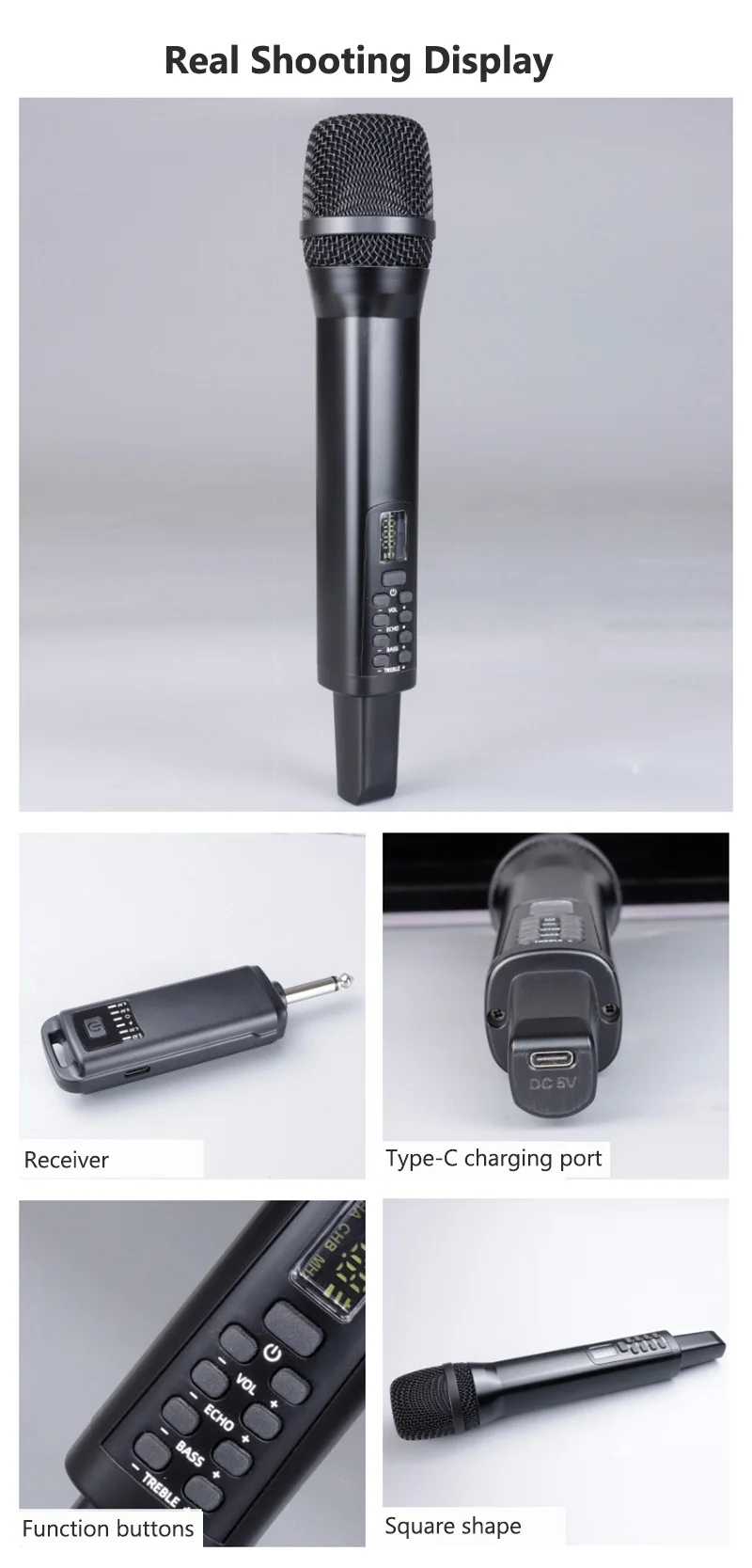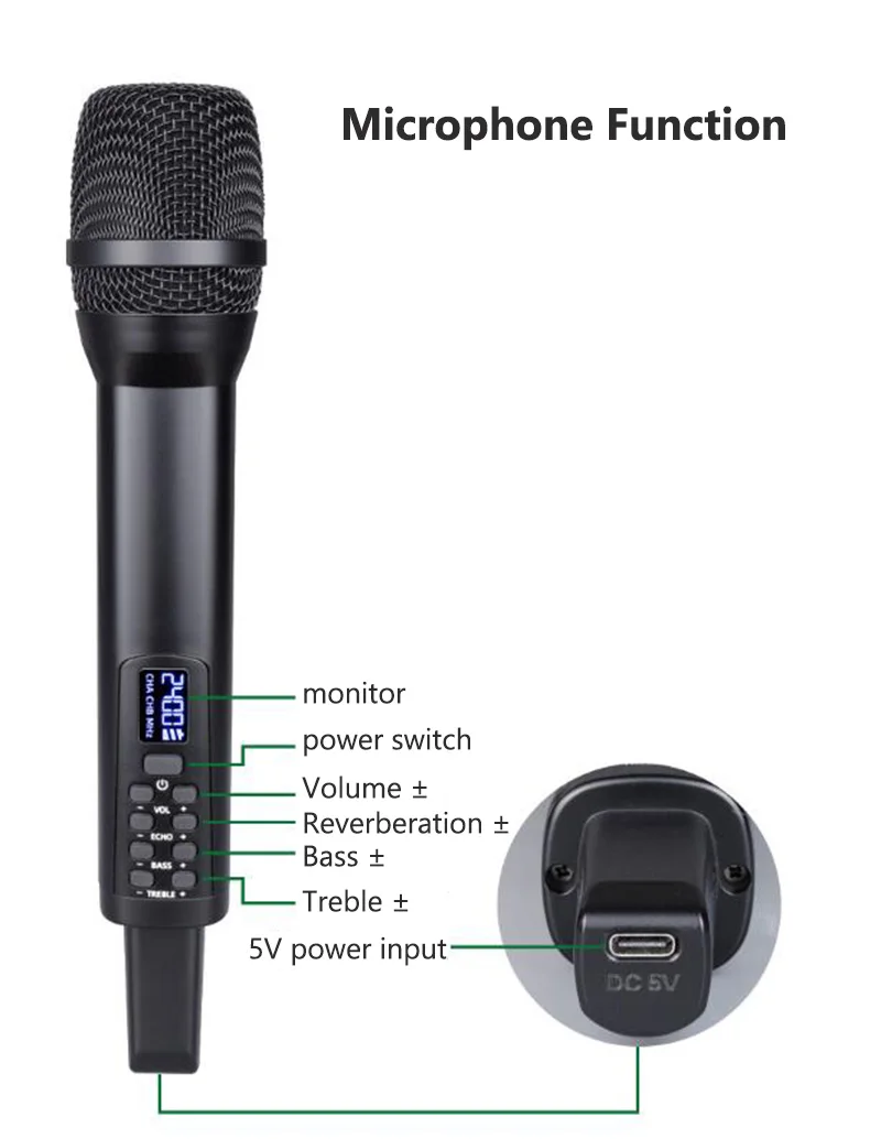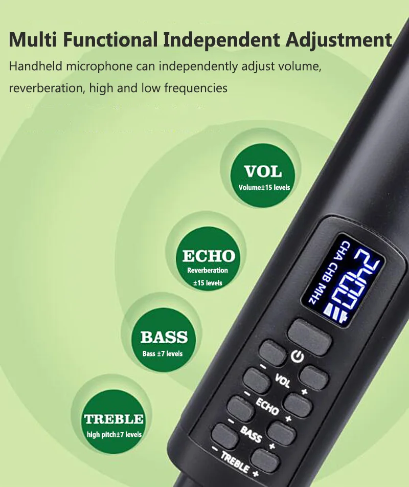 * Multi-function independent adjustment. The handheld microphone can independently adjust the volume, reverberation, high and low bass.