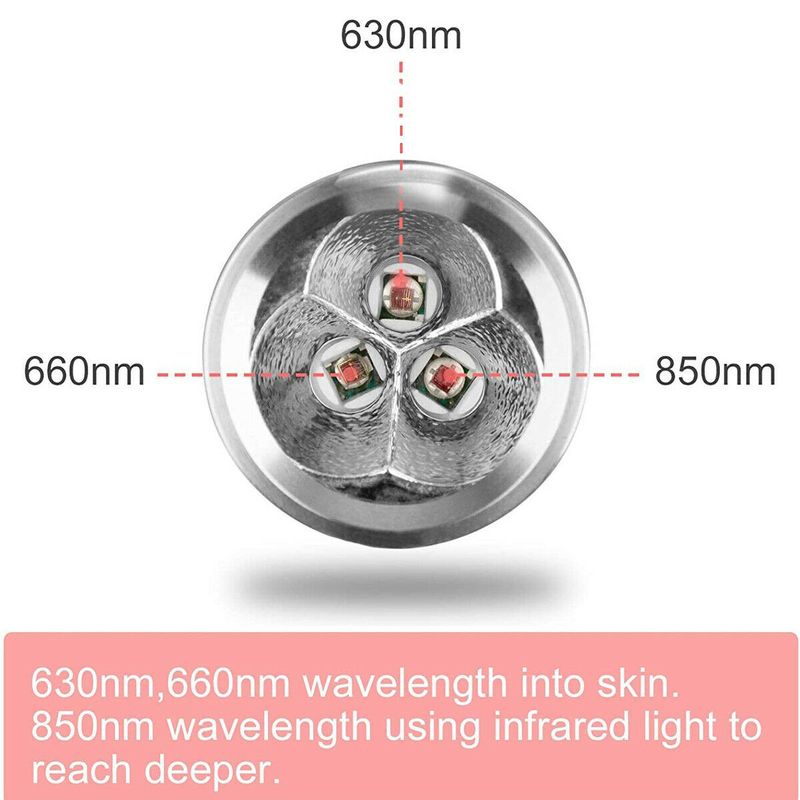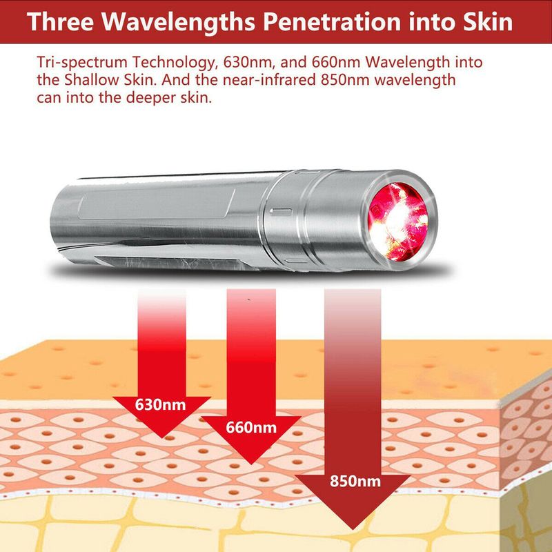 - 630nm 660nm and 850nm these 3 wavelengths are the perfect comb of light therapy. As the red light doesn't penetrate as far into the skin, it is suitable for superficial treatment, like reduce wrinkles. while the near-infrared penetrates deep into the skin, direct to the pain point, and more effectively relieving pain.So it's very helpful for joint pain of the legs, muscle ache of the back, shoulders, finger, knee, foot, cervical soreness.