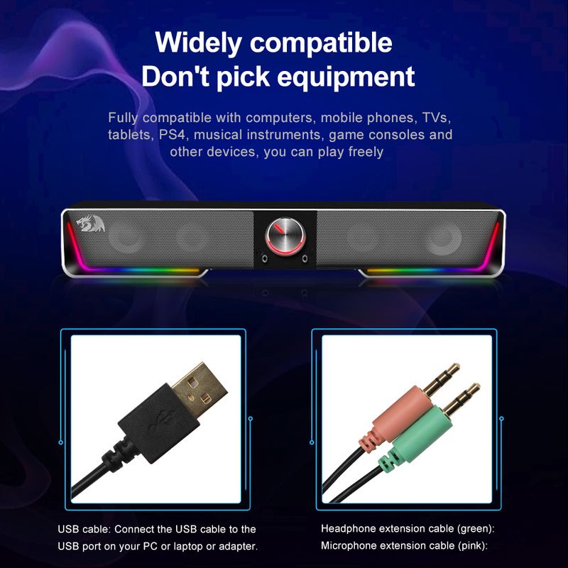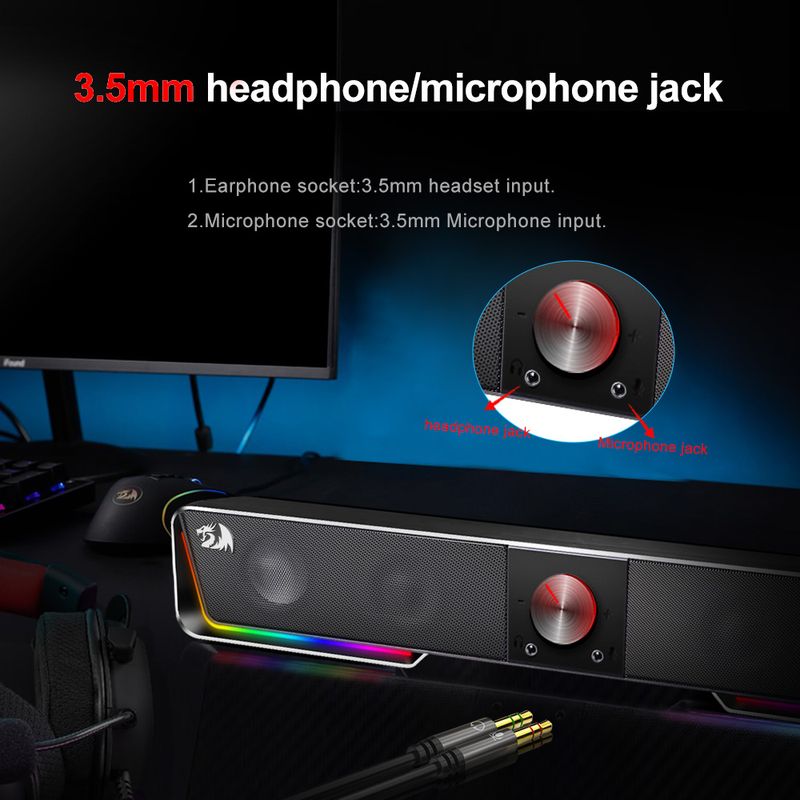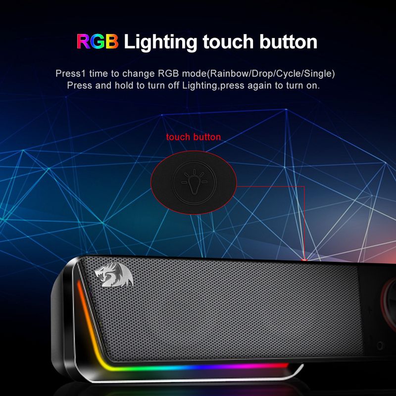 Redragon sound bar packs Audio prowess with finely tuned dual 1.5W drivers to bring sound to life for a fantastically dynamic Audio experience Support BT and AUX input RGB lighting,Easily turn on/off the light or change the color mode with the touch button on the top Wired Connection to other devices via the 3.5 mm aux cord Remarkably compact computer speaker is slim enough to sit flat below monitors to save space keep your desk clutter free