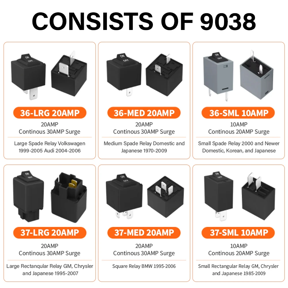 Wide Compatibility & Effortless Control: This Relay tester kit is designed for seamless compatibility with a wide range of vehicles, including Audi, BMW, Volkswagen, GM, Chrysler, and more. Our relay bypass kit also replaces multiple relay models (9038, 9036, 9037) and provides direct control over fuel pumps, window motors, headlights, and other components