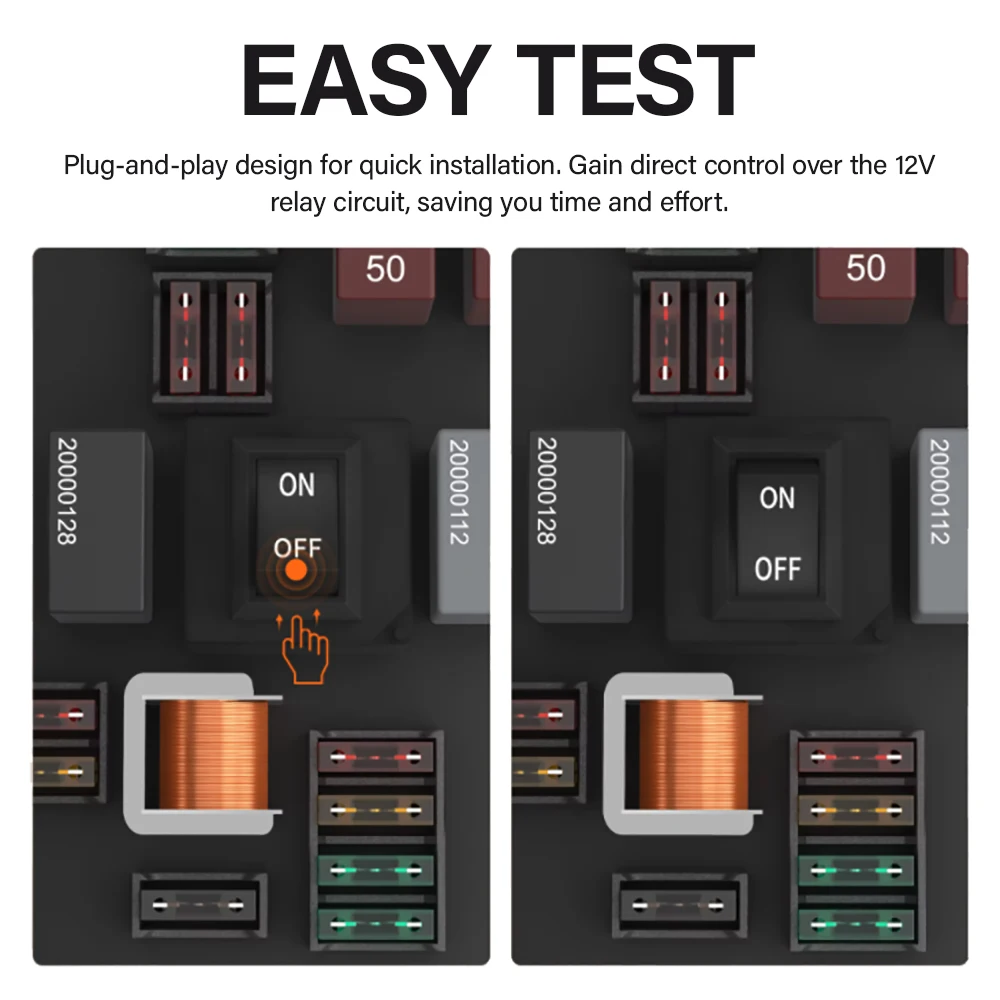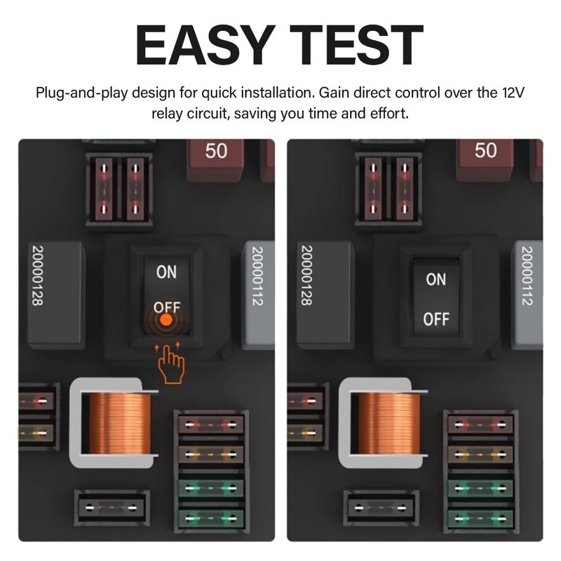 Reliable Performance & Built to Last: Crafted from high-quality materials, this relay tester is rigorously tested to meet or exceed OEM standards. Our relay bypass switch kit enjoy consistent operation with its 20 amp continuous and 30 amp surge current (12V) capacity, ensuring long-lasting performance