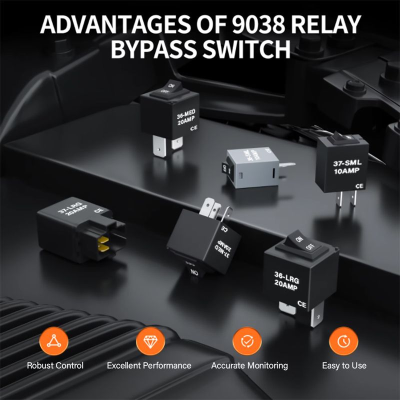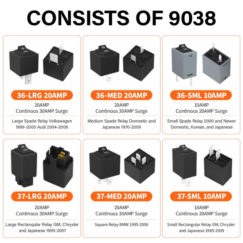 Component Included: Our product include relay bypass switch kit 9036-1(36-LRG 20AMP), 9036-2(36-MED 20AMP), 9036-3(36-SML 10AMP), 9037-1(37-LRG 20AMP), 9037-2(37-MED 20AMP), 9037-3(37-SML 10AMP)