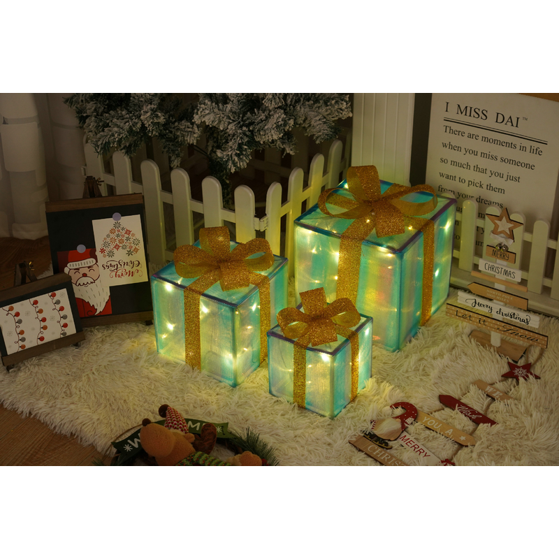 Remote Control Christmas Gift Box Lights Christmas Three-piece Decoration Peacock Blue Stripes