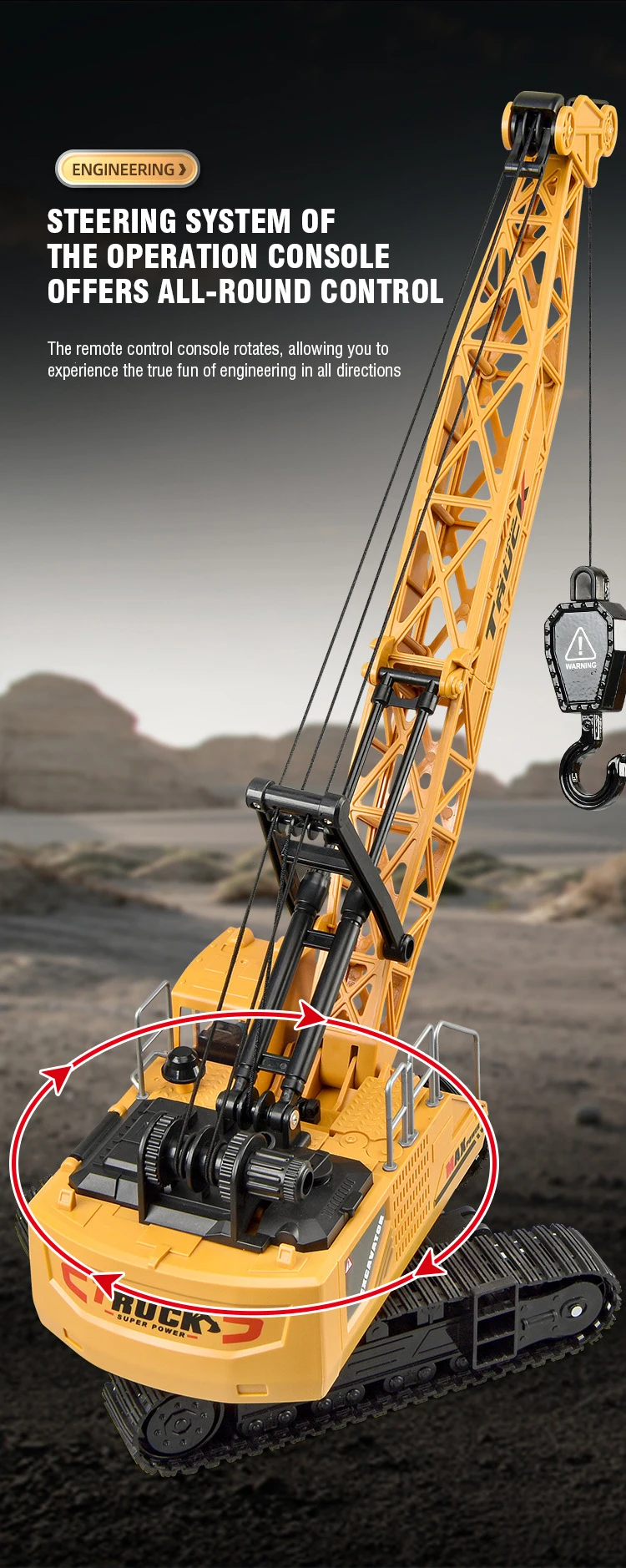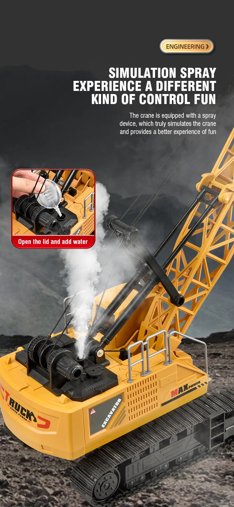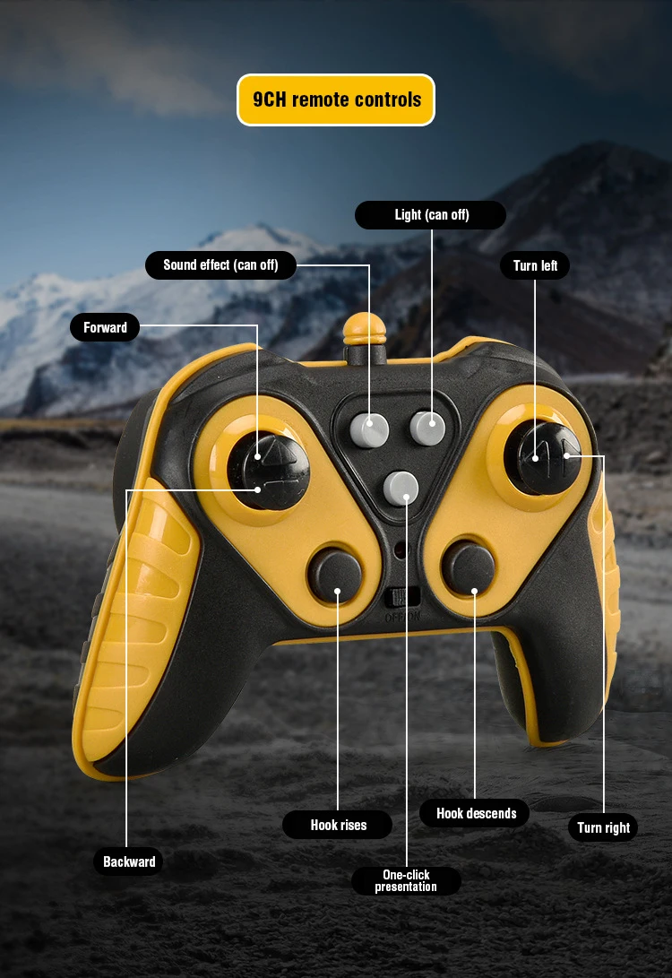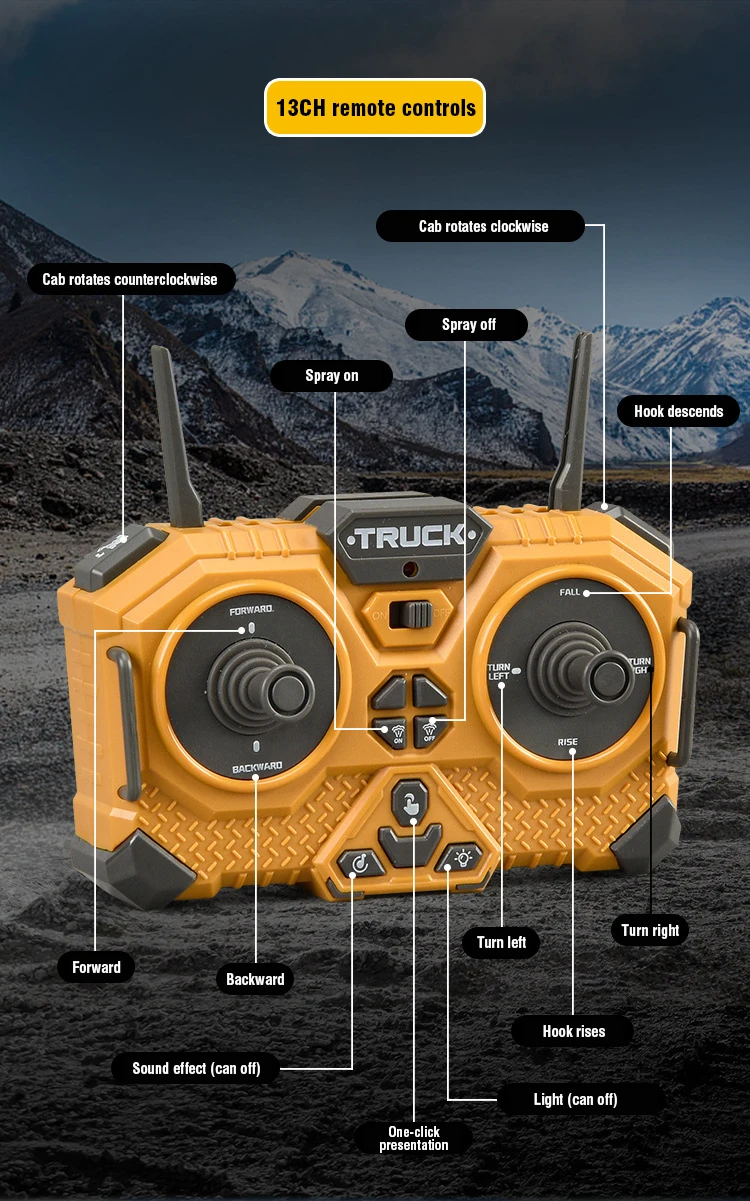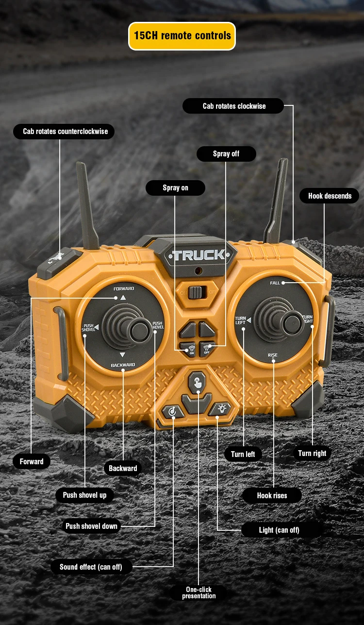- Simulation modeling, colorful, suitable for indoor and outdoor play, more suitable for multi-site control- 2.4G signal is not interfered, remote control distance is long9 channels: front and back, left and right, mining, unloading, one-button demonstration, table to the left and right remote control 680 degrees11 channels: Forward, left and right, hook up and down, shovel pushing, one key demonstration, remote control of the console to the left and right at 680 degrees13 channels: Forward, backward, left turn, right turn, 680 degrees of turntable, lifting hook ascending, descending, sound effect, light, spray, push shovel, one button demonstration15channels:Hand shovel,front and back, left and right, digging, unloading, moving up and down, spray opening and closing, one-button demonstration, table to the left and right remote control 680 degrees