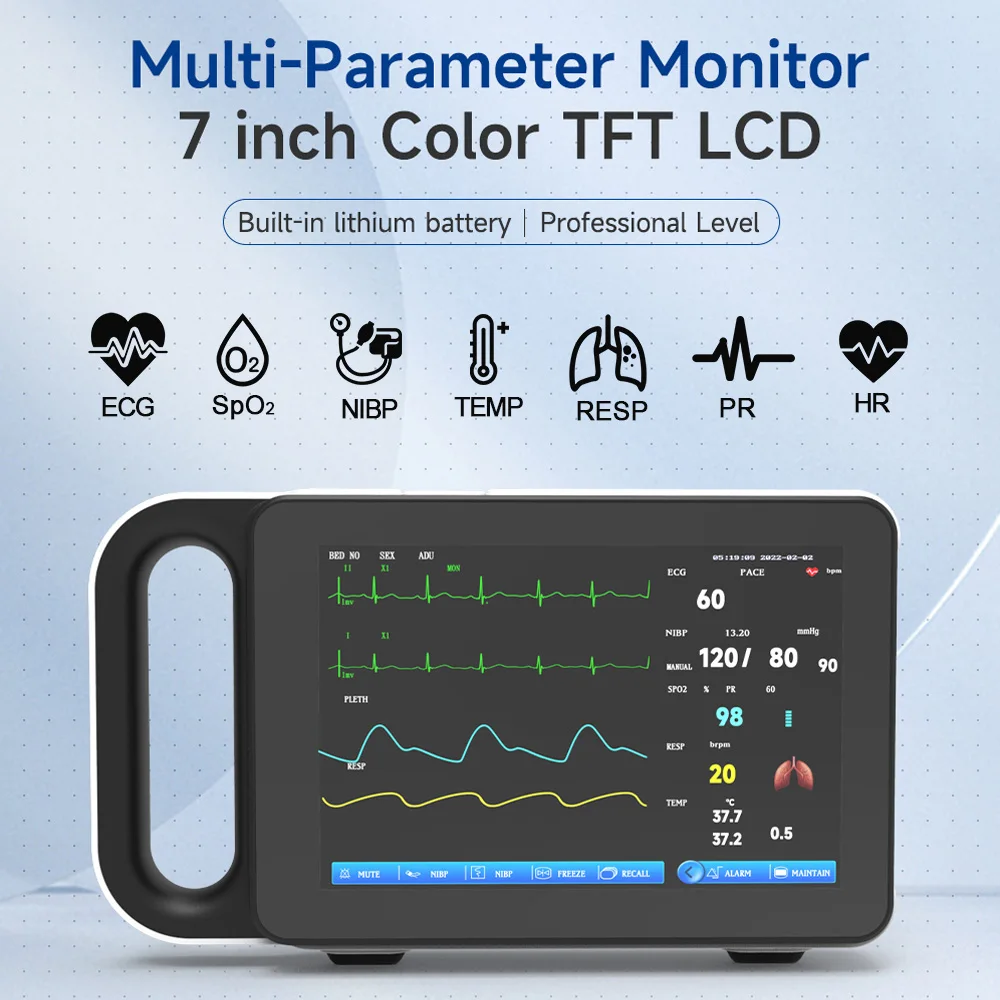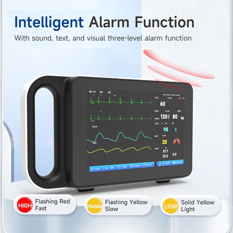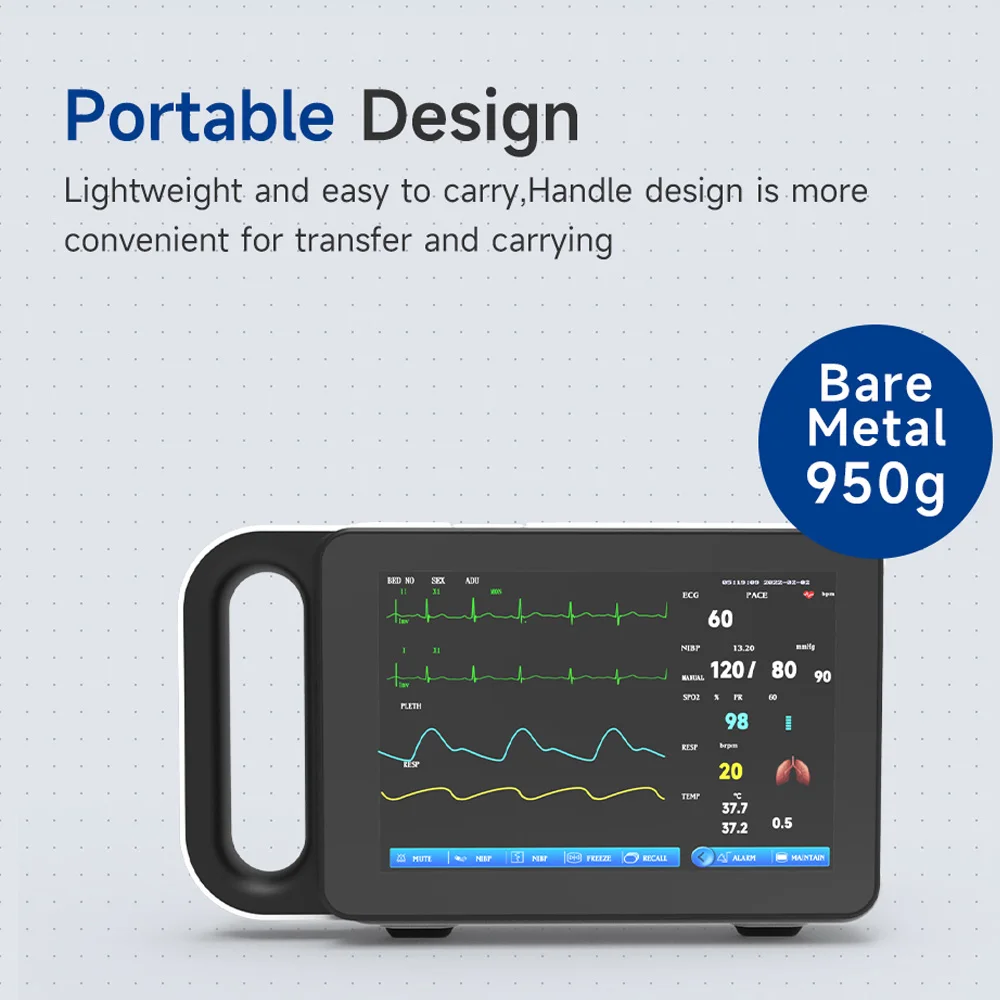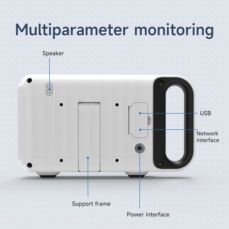 Resoxy E7 patient monitoring device is a professional medical patient monitor, supports multi-parameter real-time monitoring, including ECG, SpO2, NIBP, RESP, TEMP, PR, and HR vital signs monitoring. Suitable for various medical scenarios, including ICU, CCU, Operating room, and general ward. And with a built-in 2000mAh large capacity rechargeable Li-ion battery, E7 patient monitor can meet the requirements of mobile medical aids.