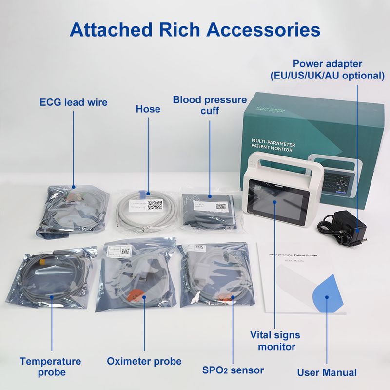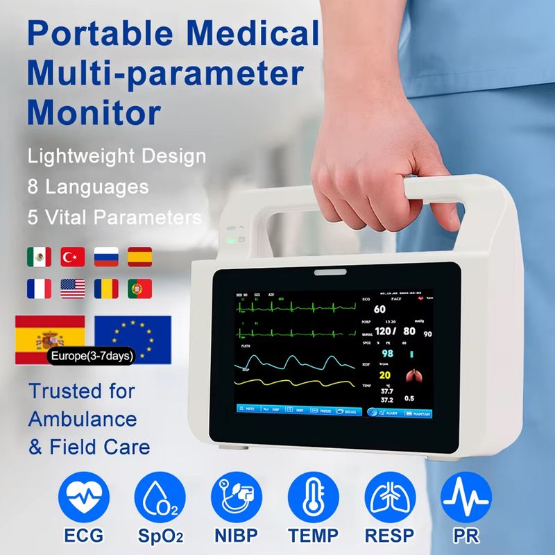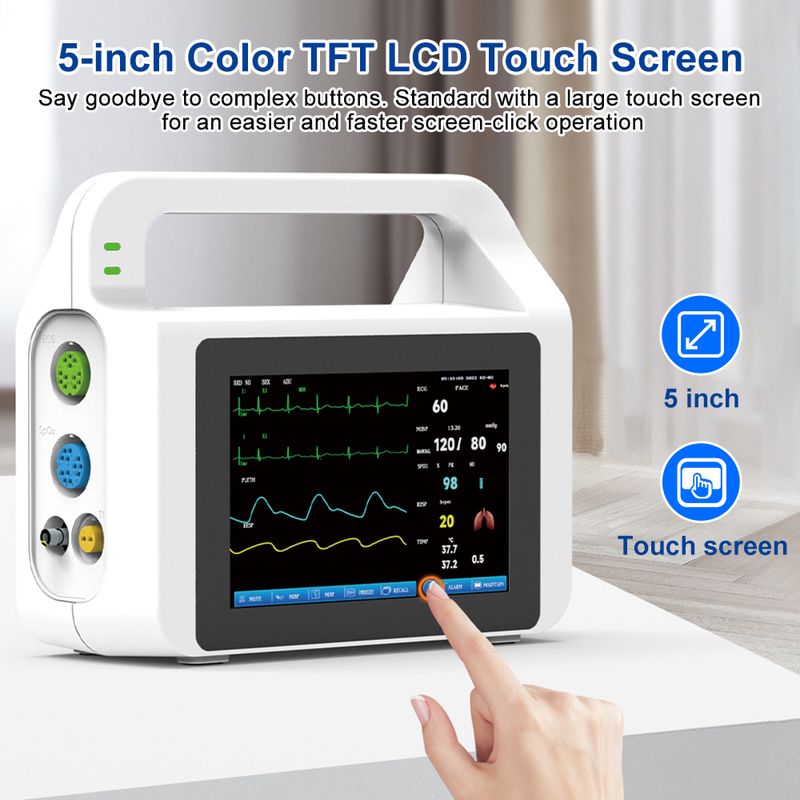 This patient monitor features a 5-inch color TFT touch screen that displays real-time data and waveforms. It monitors key parameters including SPO2, NIBP, PR, TEMP, ECG, and HR, supporting use across adult, pediatric, and neonatal patients. Designed for versatility, it is ideal for mobile medical scenarios such as ambulances and helicopters, as well as for personal daily monitoring.