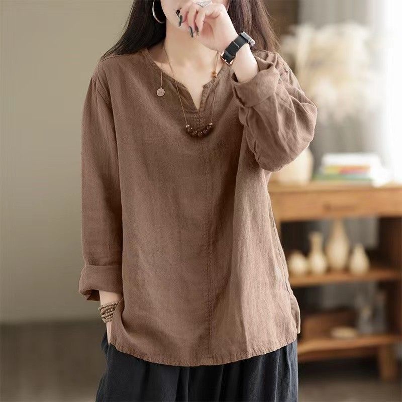 Retro Casual Loose Long Sleeve Split Women's Shirt Dark Brown M