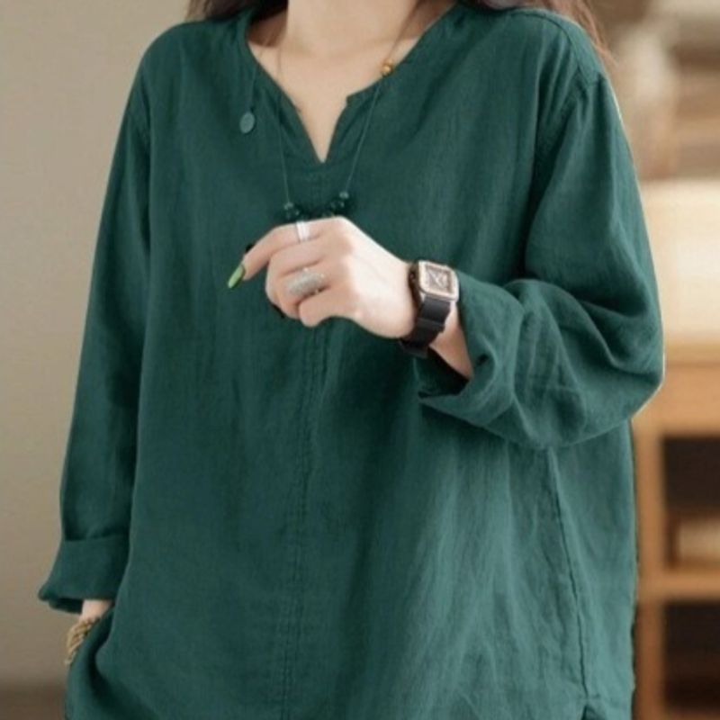 Retro Casual Loose Long Sleeve Split Women's Shirt Green 5XL
