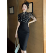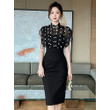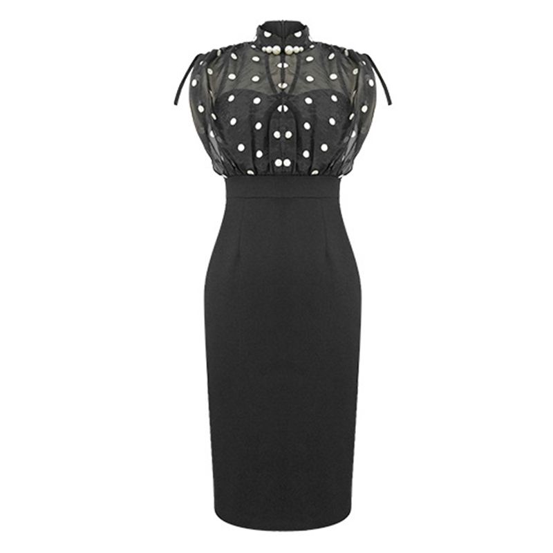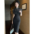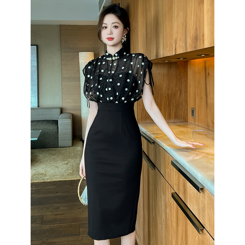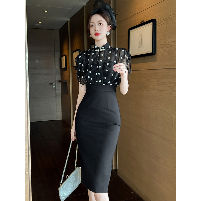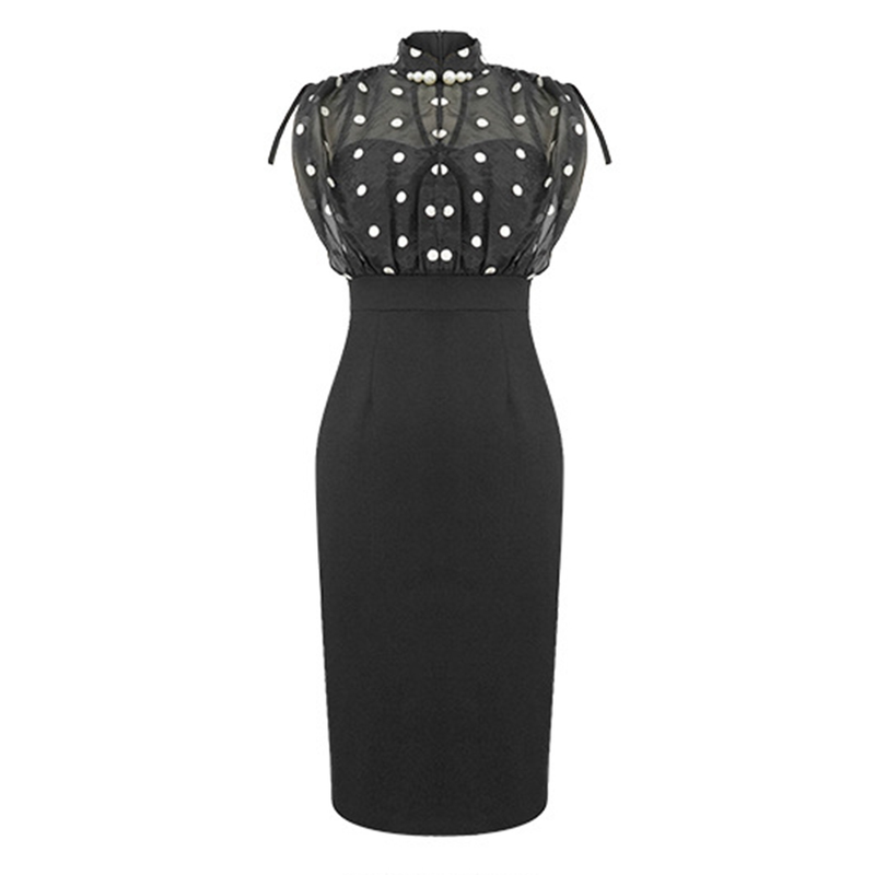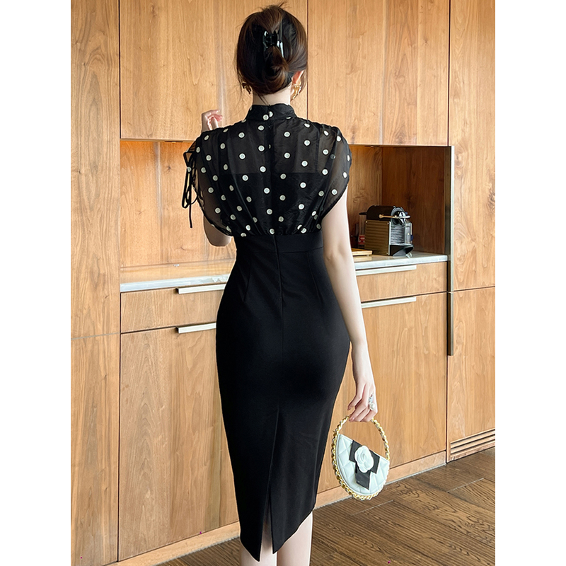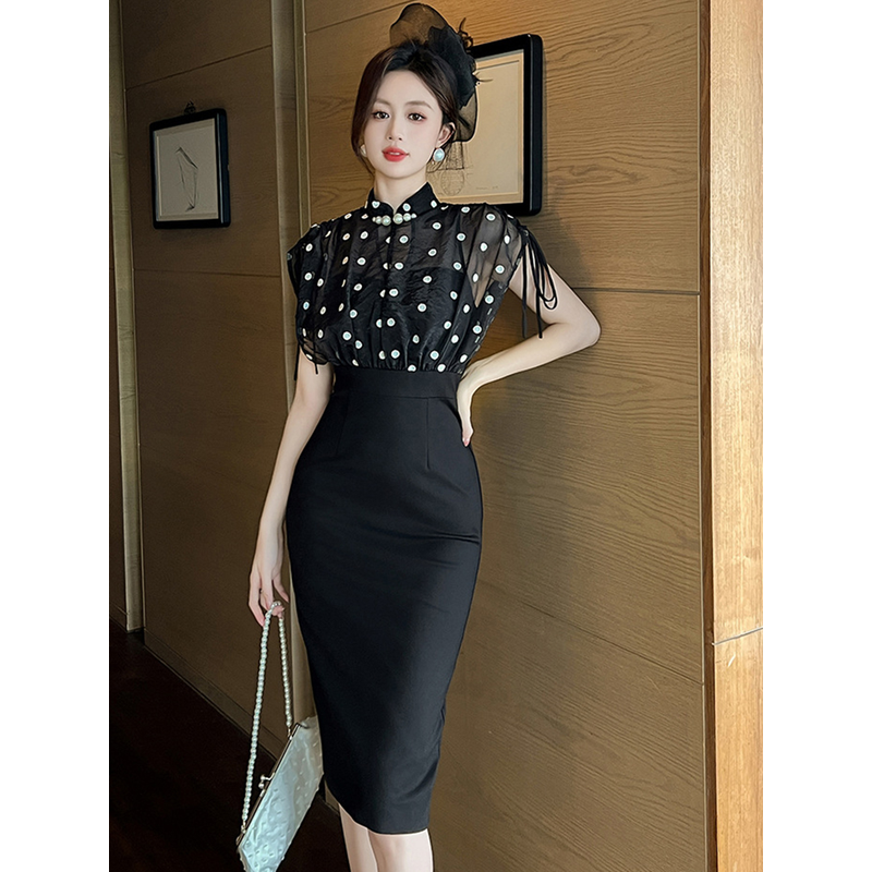 Retro Cheongsam Fake 2 Piece Party Dress Women Elegant Sheer Dot Mesh Splice Pearl Button Drawstring Midi Robe Qipao Vestidos