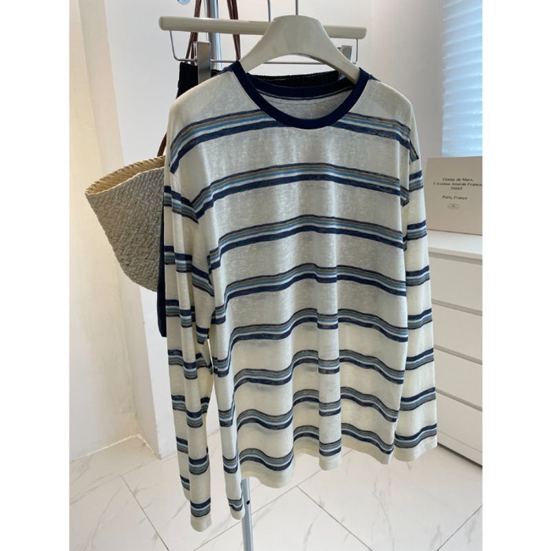 Retro Collar Striped Women's Loose Slimming Casual Long Sleeve White S