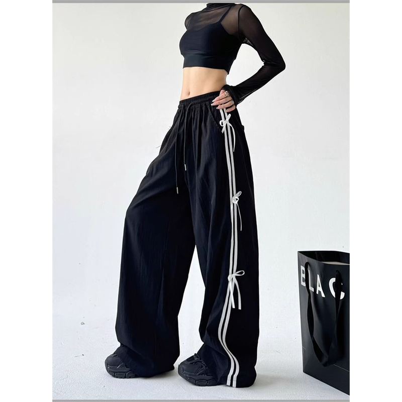 Retro Side Stripe Bowknot Wide Leg Pants Women High Waist Casual Sports Trousers Harajuku Cargo Pants Streetwear Hip Hop Joggers