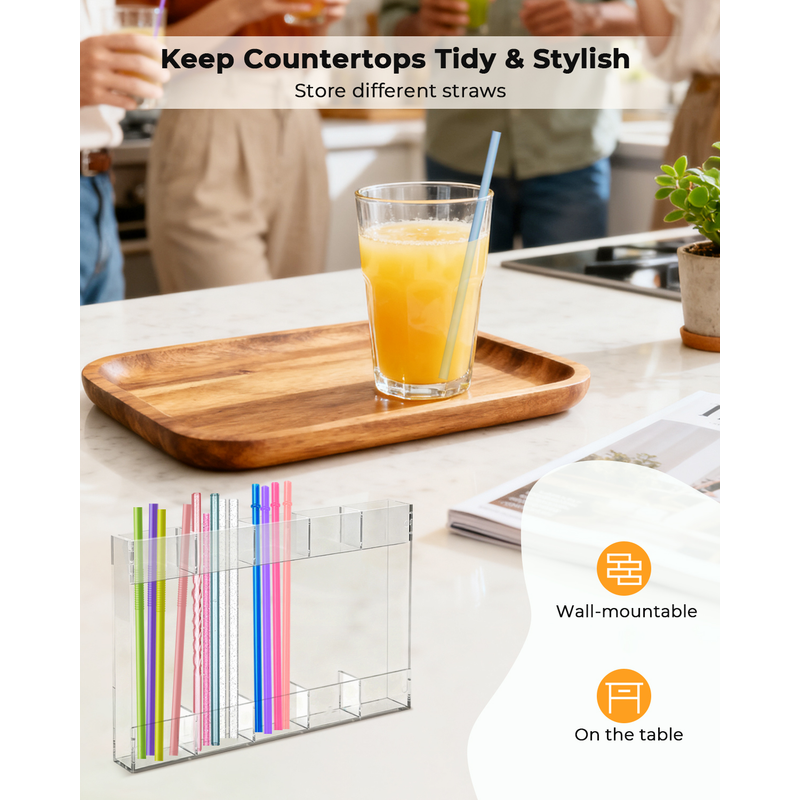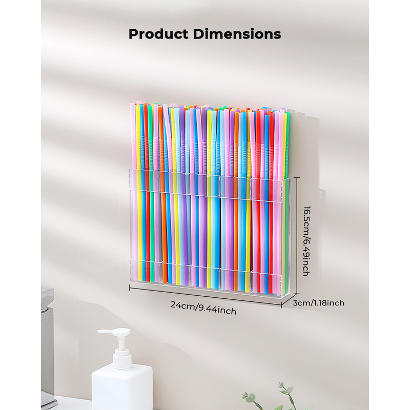 【Efficient Storage & Space-Saving】The straw holder accommodates straws of varying lengths, providing ample storage for limited spaces. Its slim design allows easy placement in kitchen cabinets, cupboards, countertops, or walls, maximizing space utilization and eliminating counter clutter