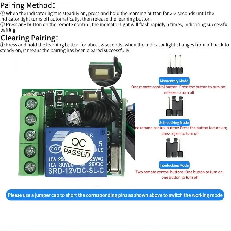 Press the learning button on the control board five times consecutively. The LED indicator will blink five times, then light up steadily. Press the corresponding remote control button to be paired. The control board LED will blink three times continuously to indicate successful pairing.