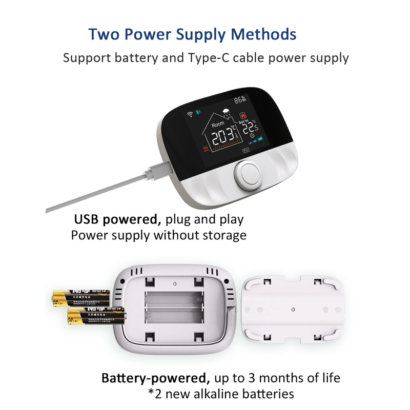 Supports alkaline battery and Type-C USB cable power supply, so you don't have to worry about losing control of your thermostat when the battery runs out of power.