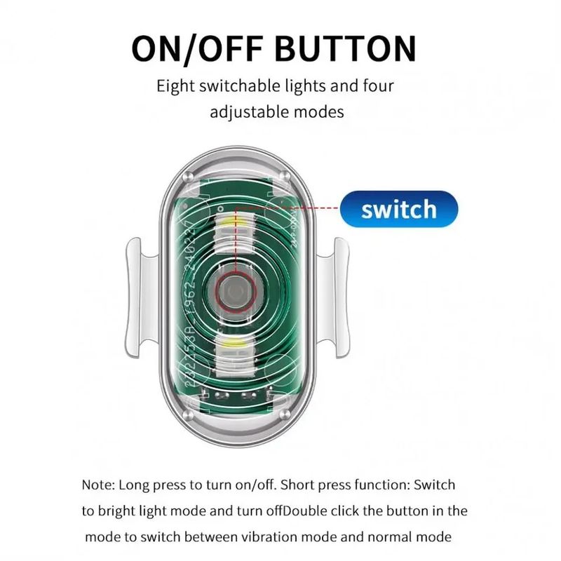 -8 lighting colors: white, red, green, blue, yellow, purple, ice blue,pink. Long press (2 seconds) to switch machines, short press to adjust modes.