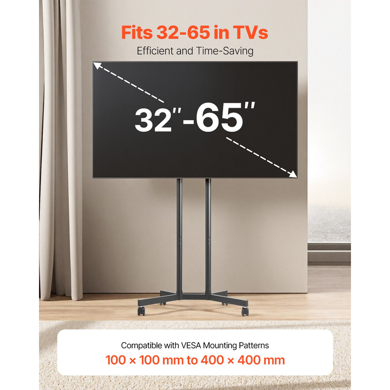 Universal Compatibility: This rolling TV stand is designed for 32-65 in LED, LCD, and OLED flat and curved TVs, supporting VESA mounting patterns from 100 x 100 to 400 x 400 mm. It ensures ideal compatibility with your TV, making installation easy regardless of the size or type of your TV.
